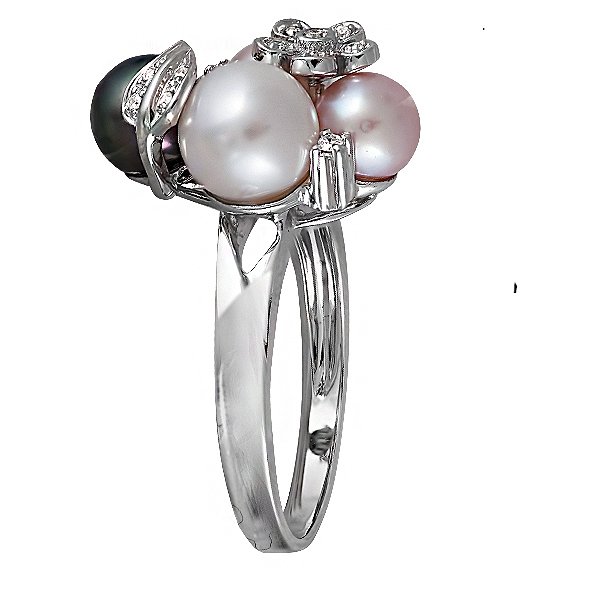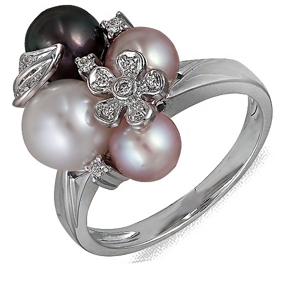 Богемный стиль кольца пленяет взор своей исключительно изящной композицией, собравшей воедино три стихии: мерцающие жемчужины, дети моря, холодные бриллианты, рождённые вулканом, и золото - обитателя гор Венцом колечка служит букет из перламутровых перлов, переливающихся угольно-чёрным, серебристо-розовым и молочным колерами, цветком из бриллиантов и тонкими гранями полированного серебристого золота.