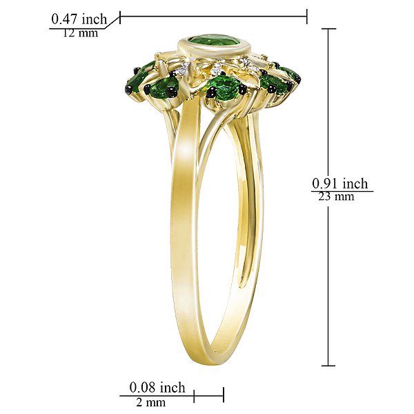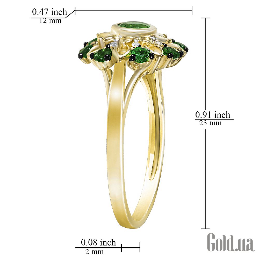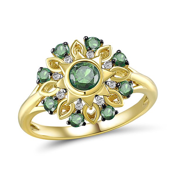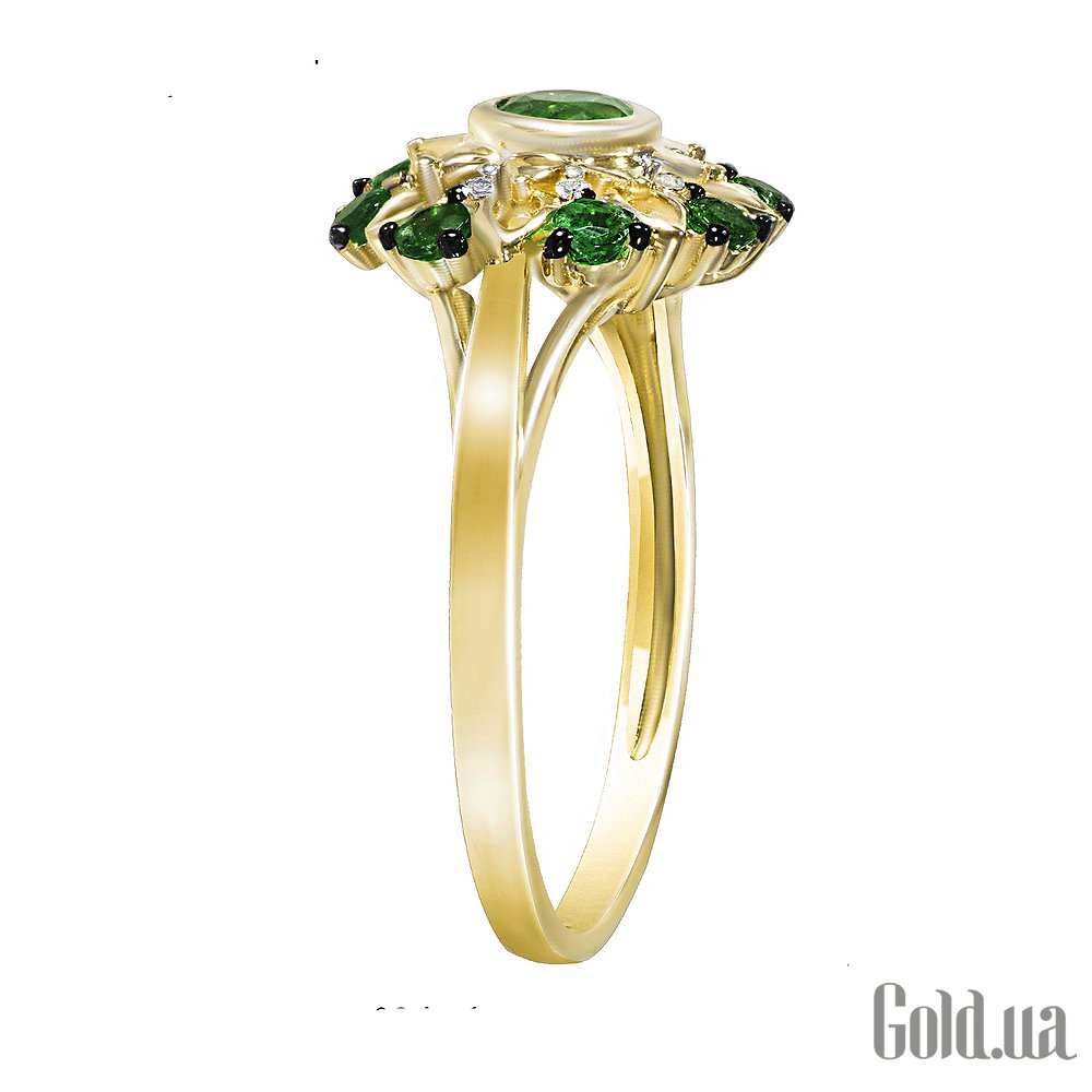 Солнечными красками и роскошной конфигурацией золотого перстня можно любоваться бесконечно. Декоративная композиция в духе древне-киевских лубочных картин потрясает идеальной палитрой и богатством отделки. Пышный цветок из золотых лепестков медового цвета украшен круглыми изумрудами, переливающимися глубокой зеленью. Между ними сверкают прозрачные бриллианты. Мелкая зернь покрывает листики золота, дополняя красивый декор.
