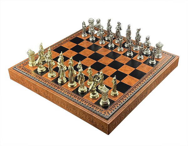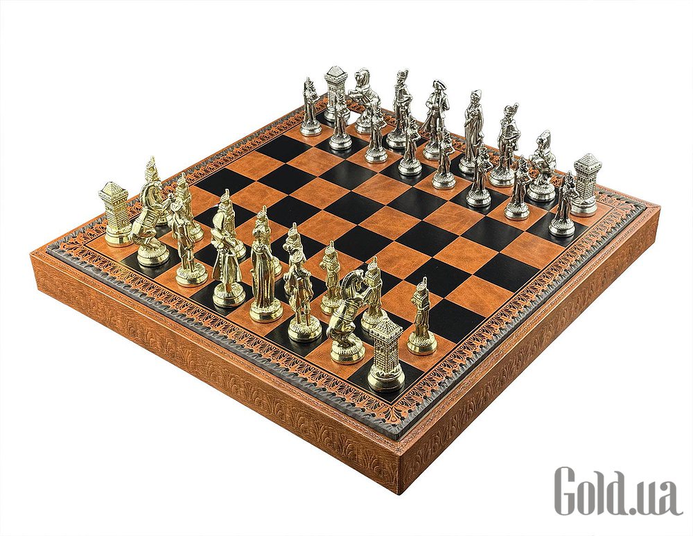 Доска изготовлена из экокожи. Размеры доски: 48 x 48 x 5,5 cm, размер квадрата: 5,2 cm. Фигурки коллекции "Napaleone" изготовлены из цинка, латуни, никеля. Размер короля: 10 cm - Ø base 3,2 cm. В комплекте идут шашки, нарды.