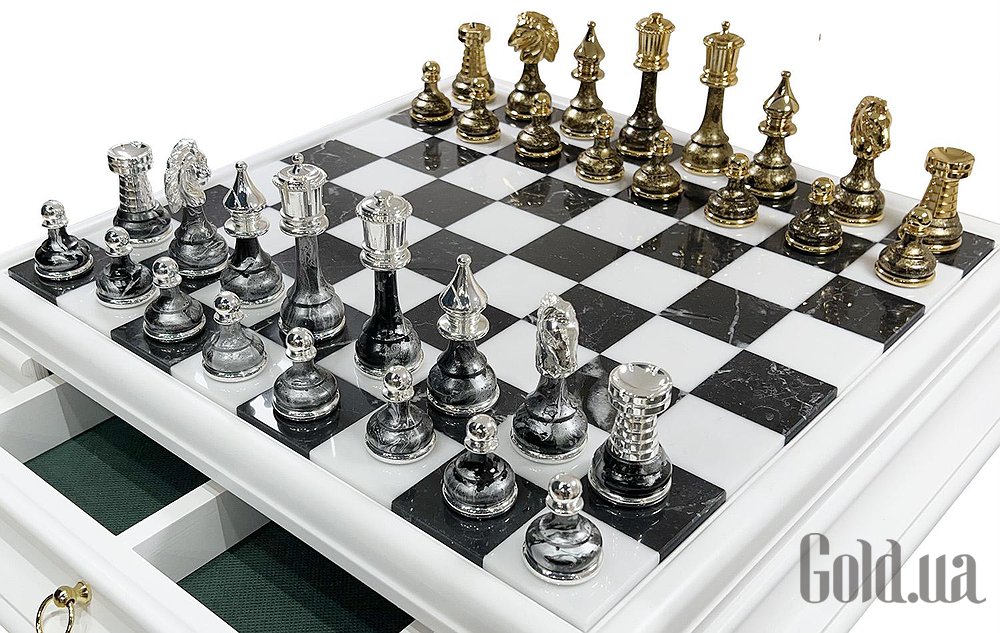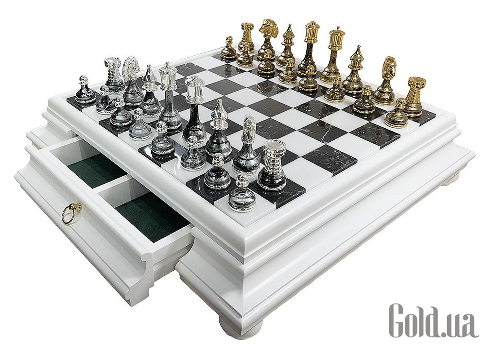 Доска изготовлена из дерева и мрамора с выдвижной шухлядкой для хранения фигурок. Размеры доски: 47 x 47 x 11 cm, размер квадрата: 4,5 cm. Фигурки изготовлены из латуни и дерева + золото 24 карата и серебро 925 пробы. Размер короля: 9 cm - Ø диаметр 3,2 cm.