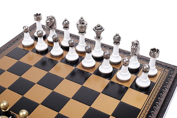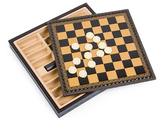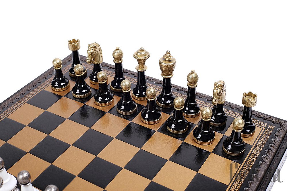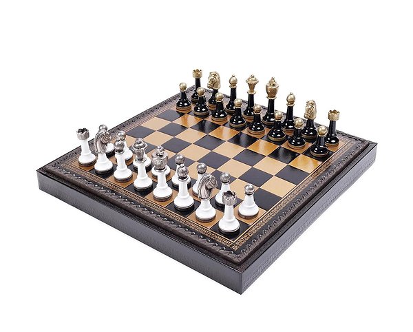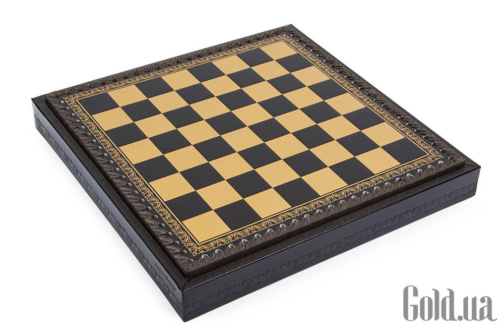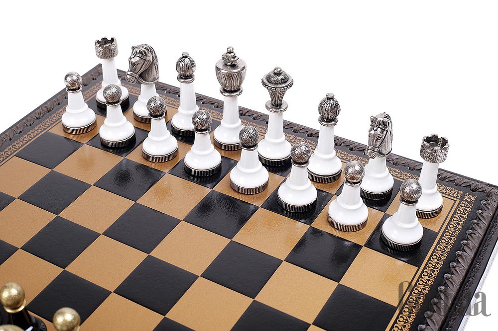 Доска изготовлена из экокожи. Размеры доски: 35 x 35 x 4 cm, размер квадрата: 3,5 cm. В комплекте идут шашки, нарды. Фигурки коллекции "Staunton" изготовлены из дерева, цинка,латуни и никелевого покрытия. Размер короля: 7,5 cm - Ø base 2,5 cm.