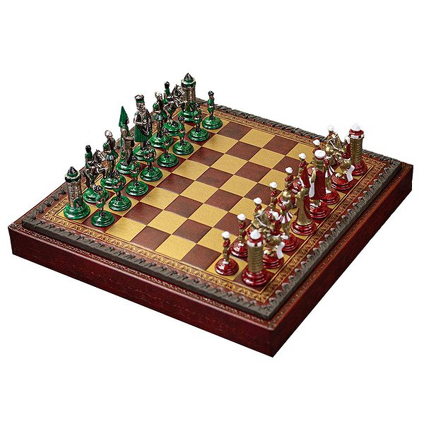 Доска изготовлена из экокожи. Размеры доски: 28 x 28 x 3,5 cm, размер квадрата: 2,8 cm. В комплекте идут шашки. Фигурки коллекции Medioevale изготовлены из латуни, никеля и цинка. Размер короля: 6,0 cm - Ø base 2,1 cm. Вес шахматных фигурок: 1360 грамм. Основа фигурок с фетровой накладкой и логотипом Italfama.