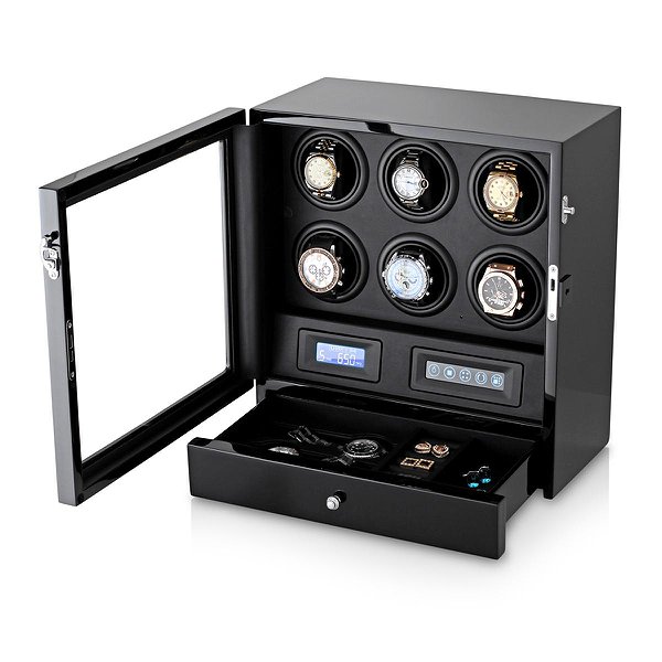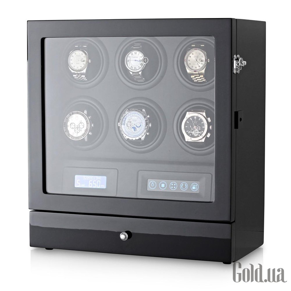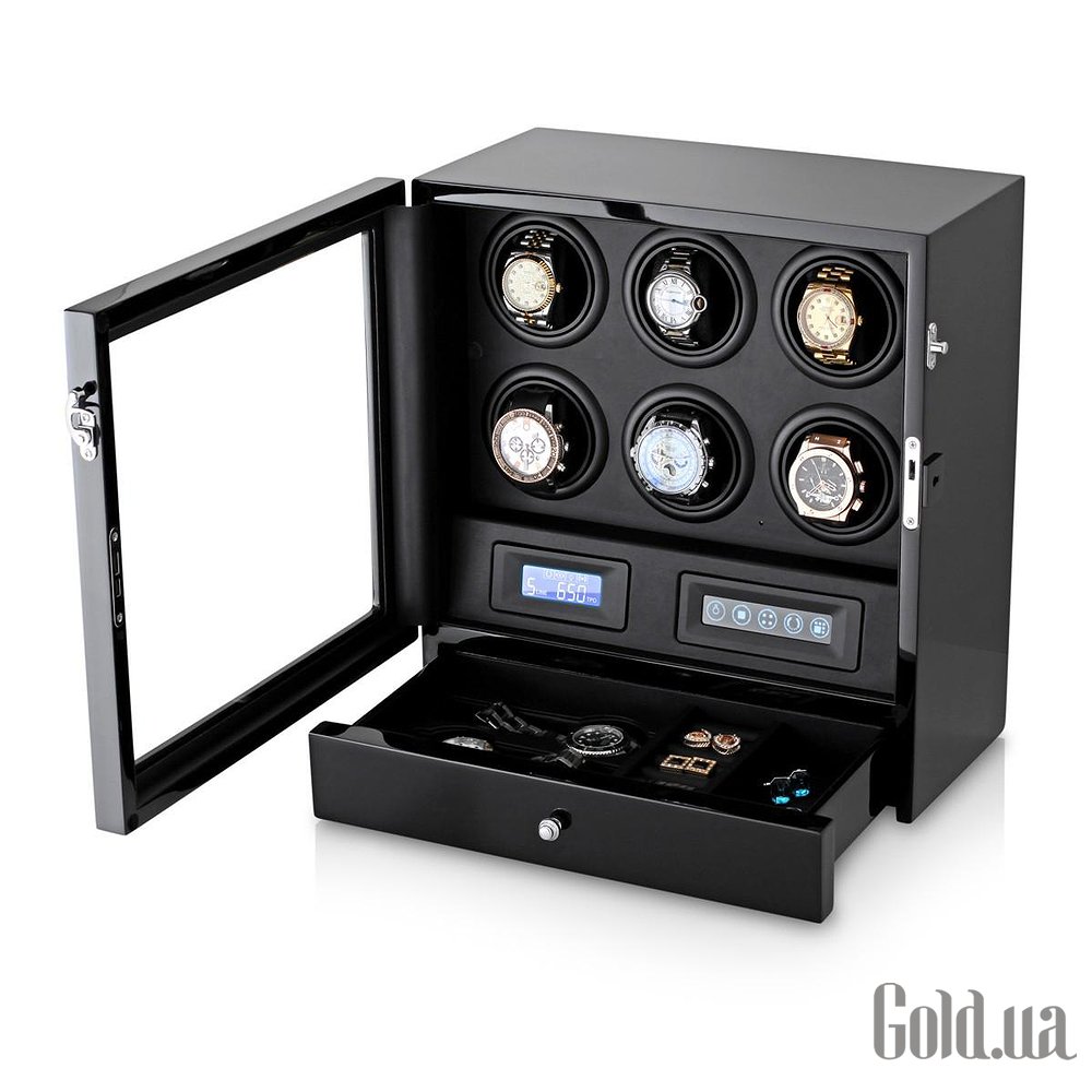 Тайммувер для 6 часов + выдвижной ящик для хранения часов либо украшений. Отполированный корпус из дерева, покрытый лаком в несколько слоев. Внутри коробки черная кожа. LED - подсветка. Дистанционное управление. 15 комбинаций программы на выбор. Три типа подзавода: по часовой, против часовой стрелки и оба вместе. Настраиваемое число оборотов: 650,750,850,1000, 1950 в сутки. Размеры шкатулки: 332мм*180мм*350мм. Вес: 6,2 кг