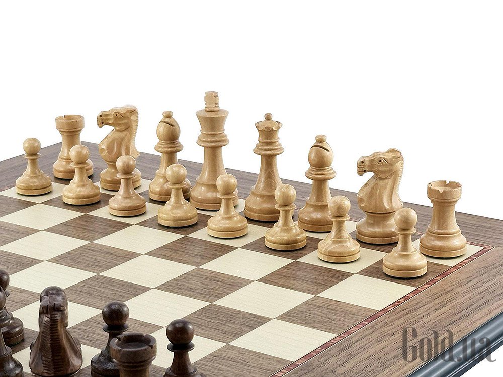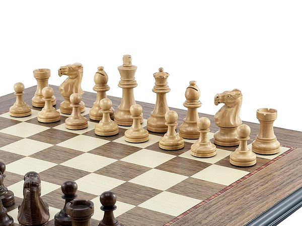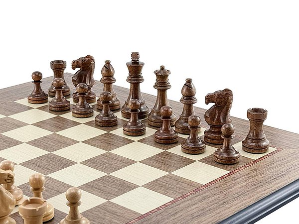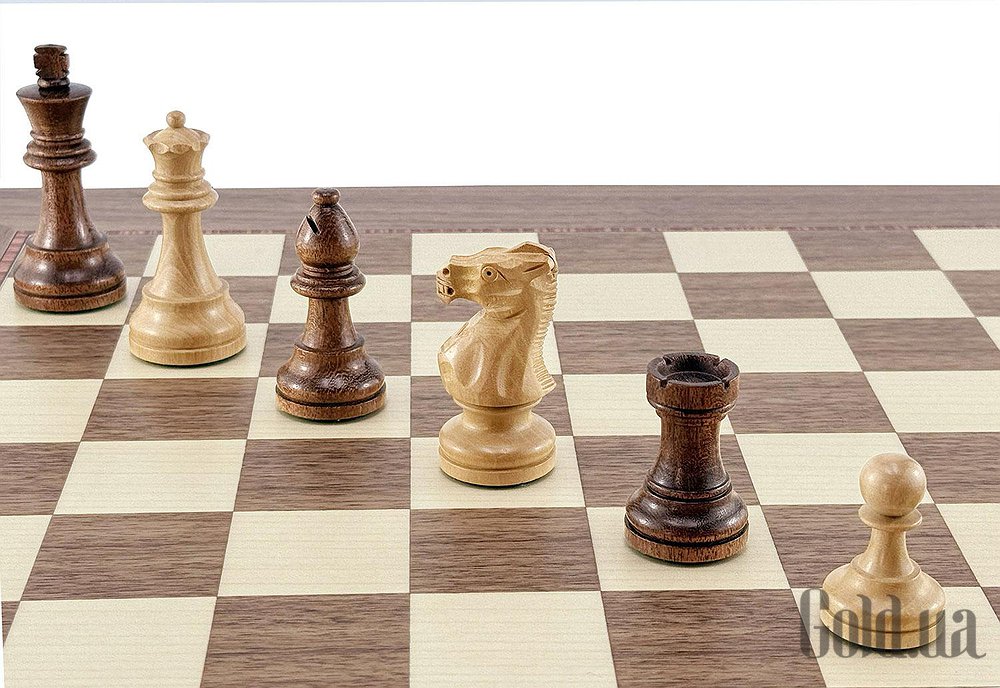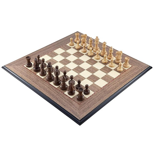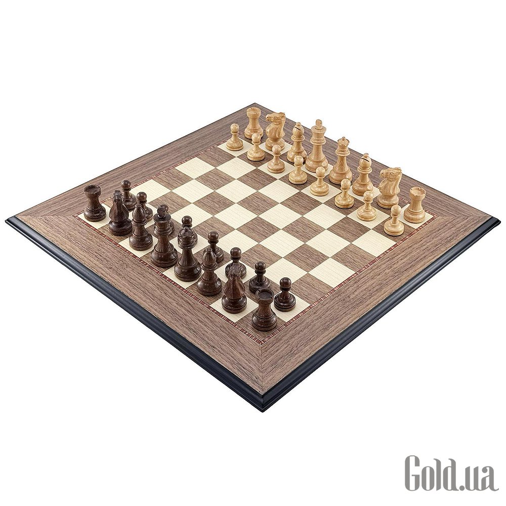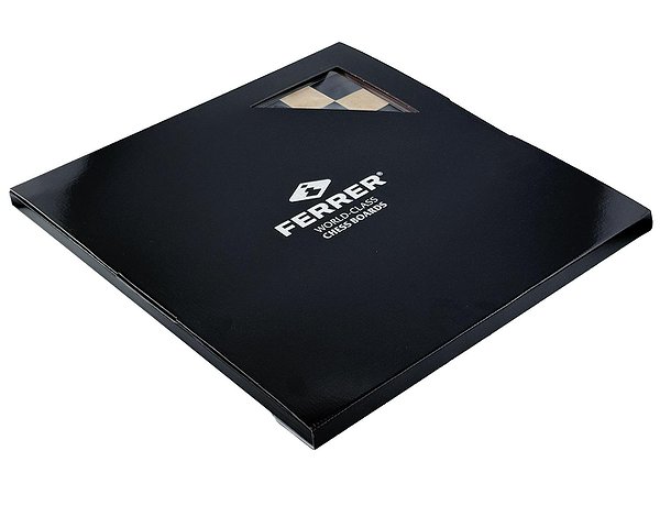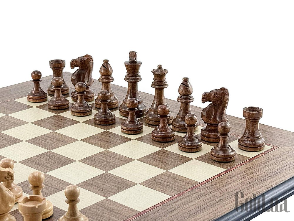 Поля из ореха и светлого клёна, элегантная чёрная рамка и матовое покрытие. Размер доски — 50 × 50 см, поля — 4,5 см, толщина — 1,2 см.