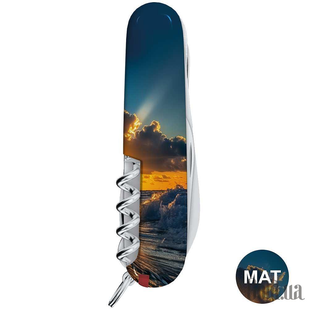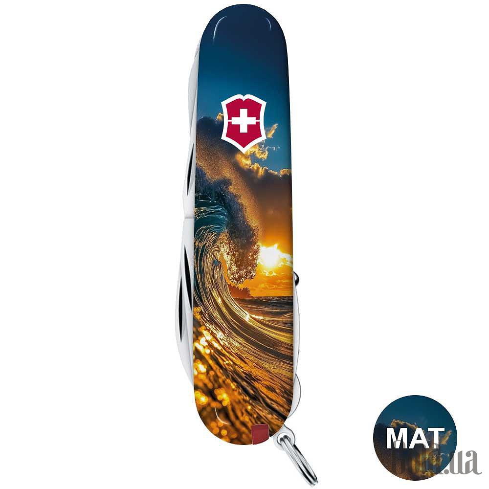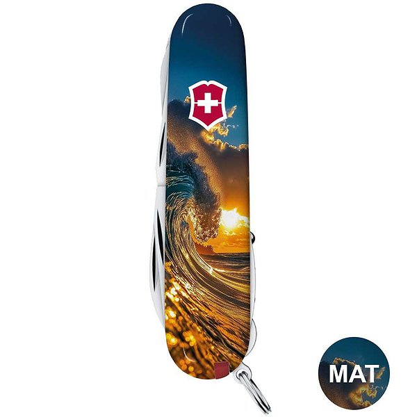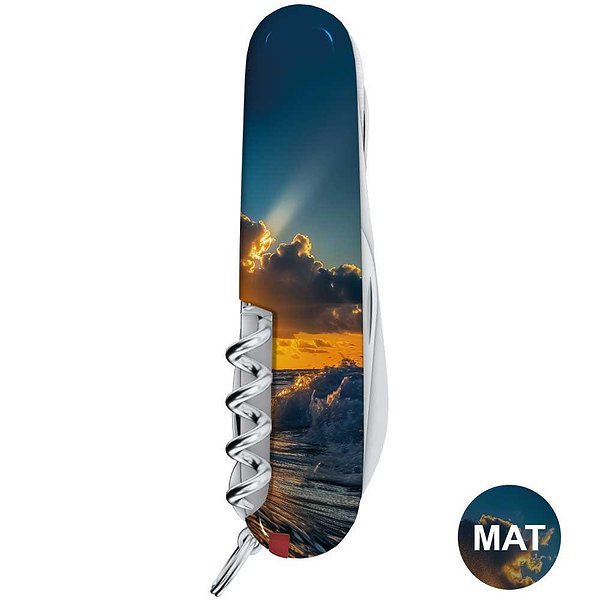 Функции: Кольцо для ключей, Пинцет, Зубочистка, Ножницы, Штопор, Малое лезвие, Булавка, Крючок многоцелевой, Пила по дереву, Большое лезвие, Шило - кернер, Открывалка для бутылок, Малая плоская отвертка, Консервный нож, Большая плоская отвертка, Паз для снятия изоляции