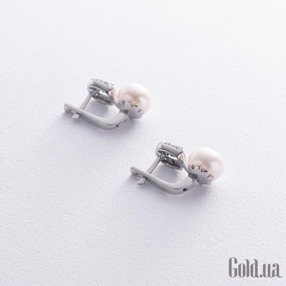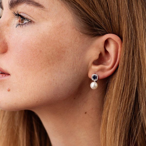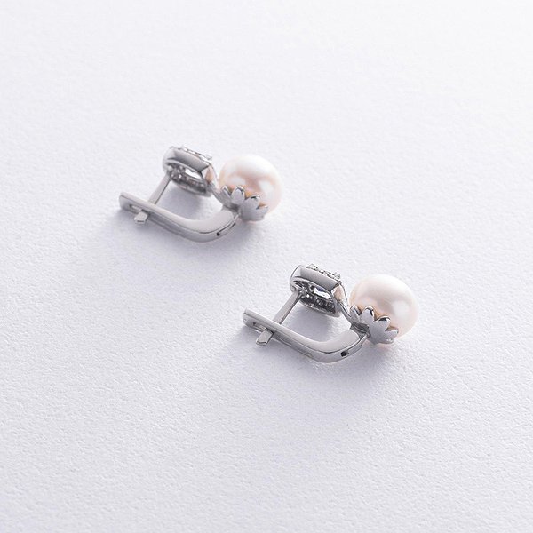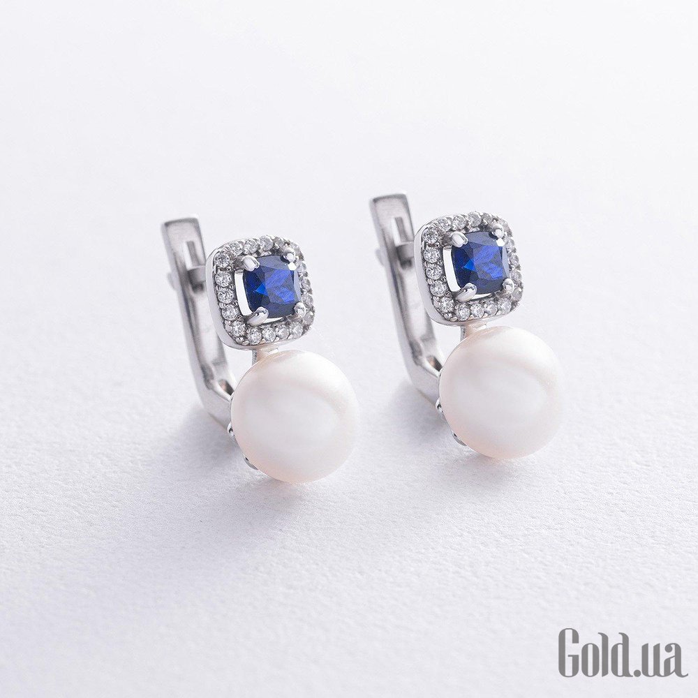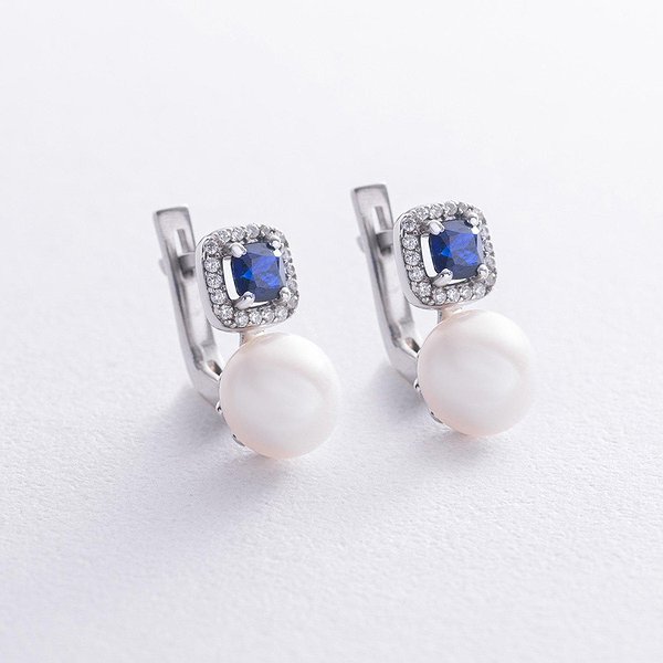 Серебряные серьги с куб. циркониями, синт. сапфирами и культив. жемчугом