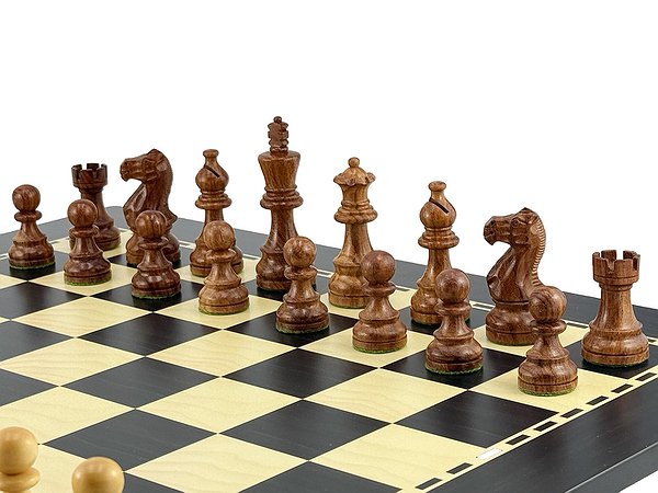 Комплект дополнен великолепной шахматной доской итальянского производства размером 50 × 50 см с глубоким и благородным покрытием под эбен. Контраст тёплых оттенков акации и тёмной роскошной доски создаёт впечатляющую эстетику, идеально подходящую как для серьёзной игры, так и для изысканного оформления интерьера.