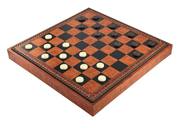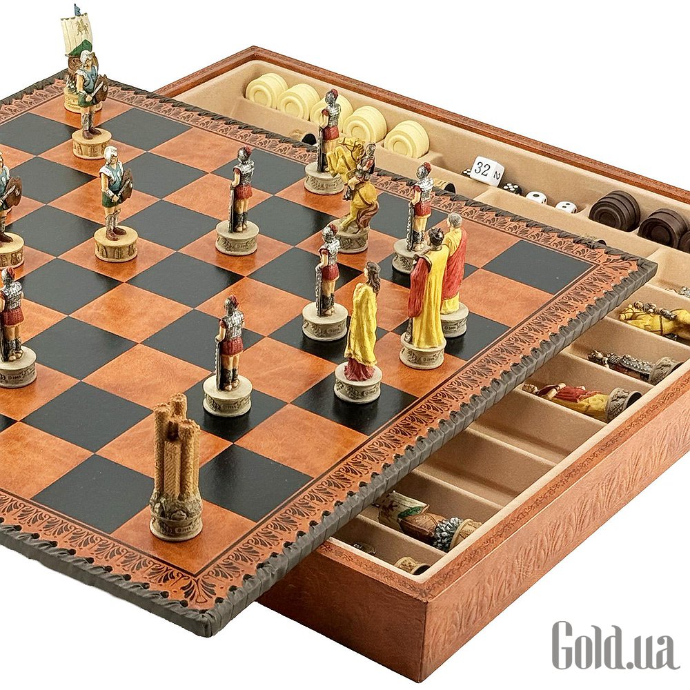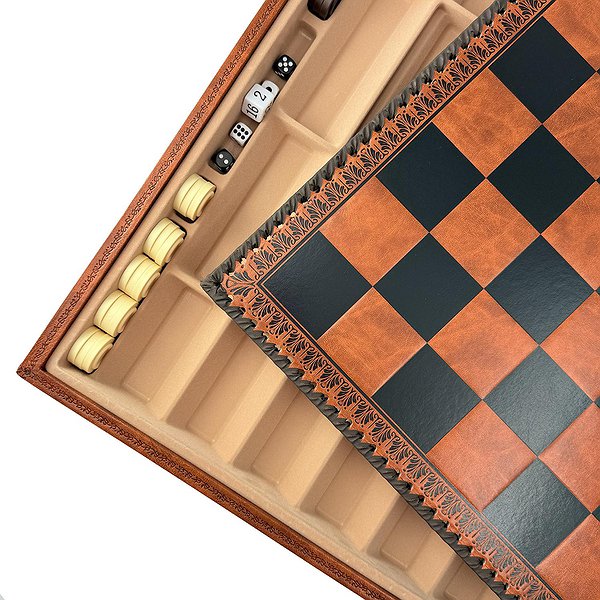 Комплект представлен на премиальной итальянской доске из искусственной кожи размером 48 см, которая служит полноценной игровой станцией. Помимо элегантного внешнего вида, доска оснащена специальным внутренним полем для шашек и нард, объединяя три классические игры в одном роскошном наборе.