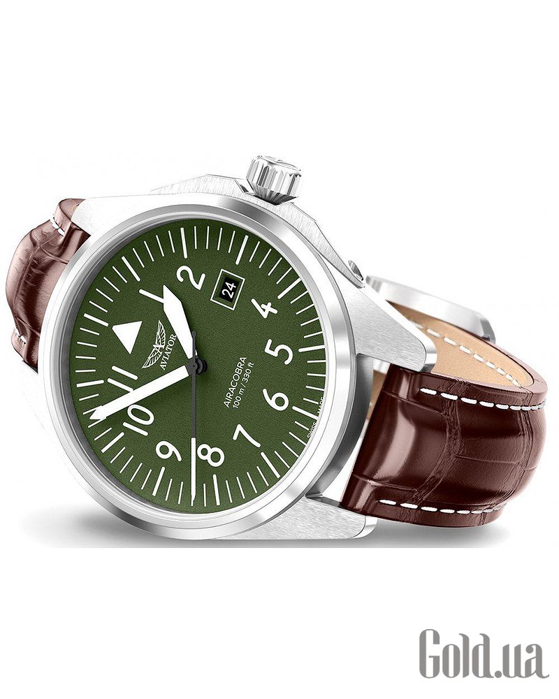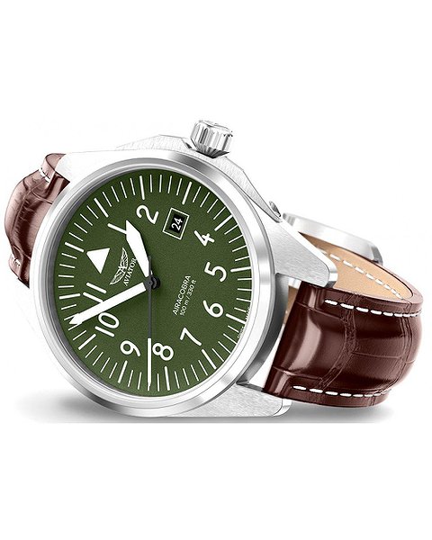Своей матовой зернистой отделкой циферблат часов напоминает приборы из кабины пилота. Лаконичные, высококонтрастные стрелки и часовые метки обеспечивают превосходную четкость и читаемость изображения, а увеличенное окно индикации даты в районе трехчасовой отметки еще больше усиливают сходство модели с авиационным прибором. Как и во всех других часах AVIATOR все детали этой модели тщательно продуманы, придавая ей навеянный авиацией оригинальный вид.