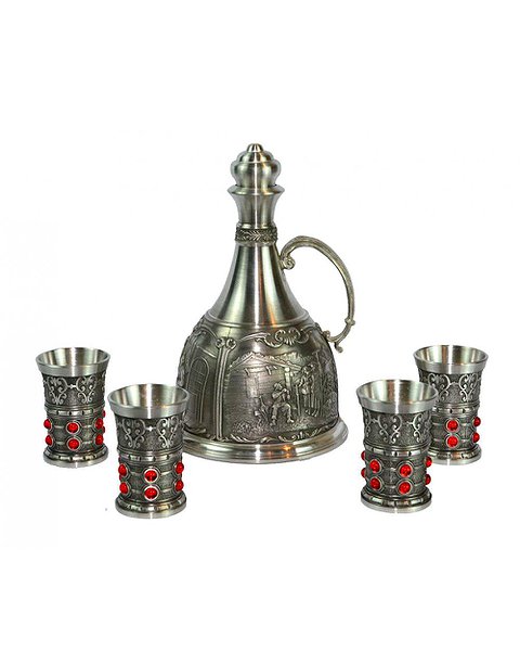 Набор состоит из штофа и четырёх рюмок, изготовлен из пищевого олова.