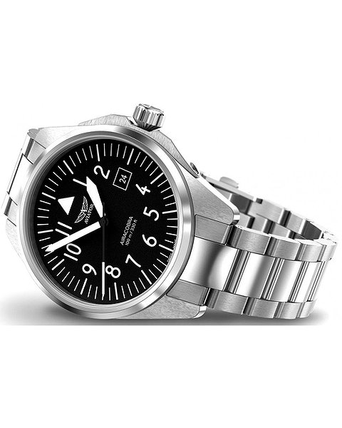 Своей матовой зернистой отделкой циферблат часов напоминает приборы из кабины пилота. Лаконичные, высококонтрастные стрелки и часовые метки обеспечивают превосходную четкость и читаемость изображения, а увеличенное окно индикации даты в районе трехчасовой отметки еще больше усиливают сходство модели с авиационным прибором. Как и во всех других часах AVIATOR все детали этой модели тщательно продуманы, придавая ей навеянный авиацией оригинальный вид.