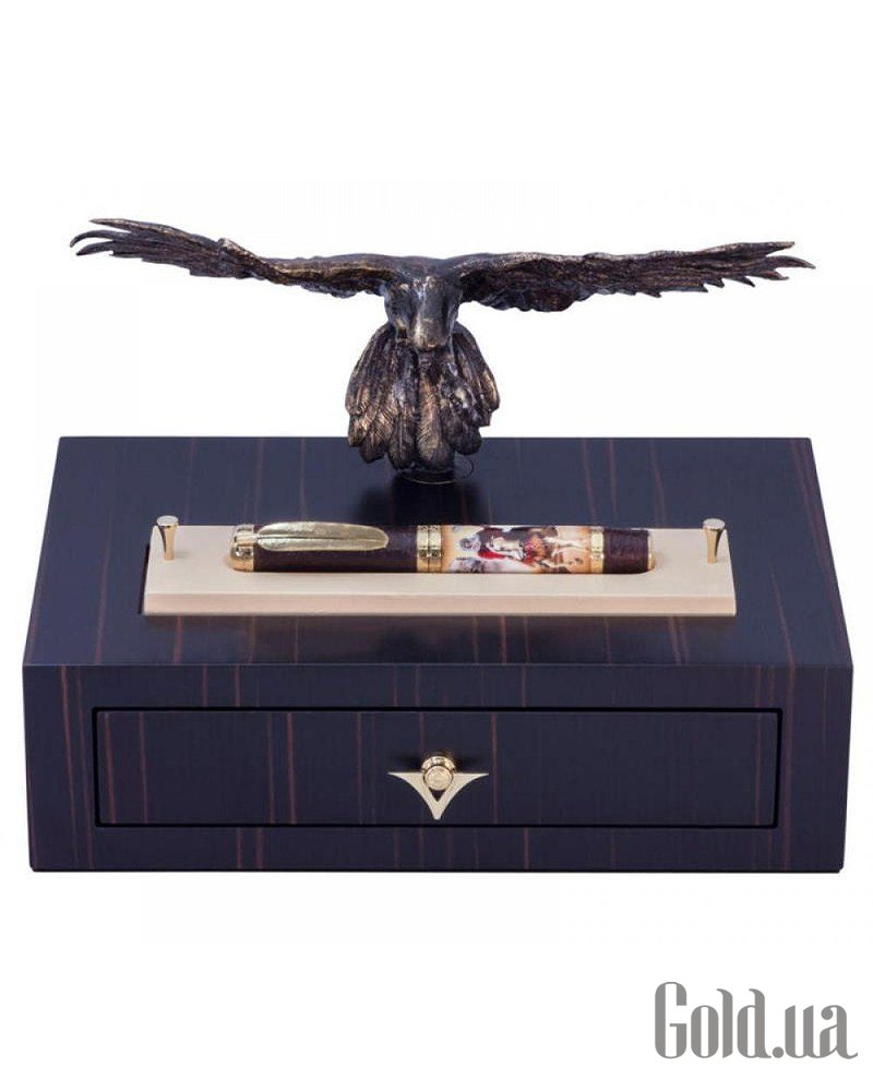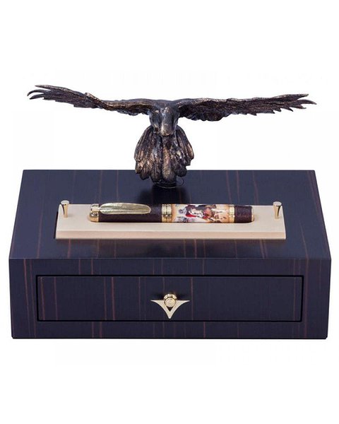 Хищная птица стоит на ящике из цельного дерева венге с видимым пространством для перьев любимой птицы. Перьевая ручка с поршнем оснащена пером Palladium Dreamtouch 23 карата.