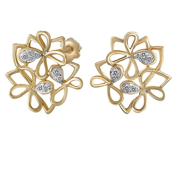 Фантазийная конфигурация золотых сережек образована из тонких контуров, напоминающих феерический букет. Изящные удлиненные лепестки красновато-золотистого колера чередуются с серебристо-белыми сверкающими овалами, покрытыми лилейными бриллиантами. Кое-где намечены линиями очертания листиков. Воздушная композиция украшения соответствует кулону, который просвечивается сияющей эфирностью.