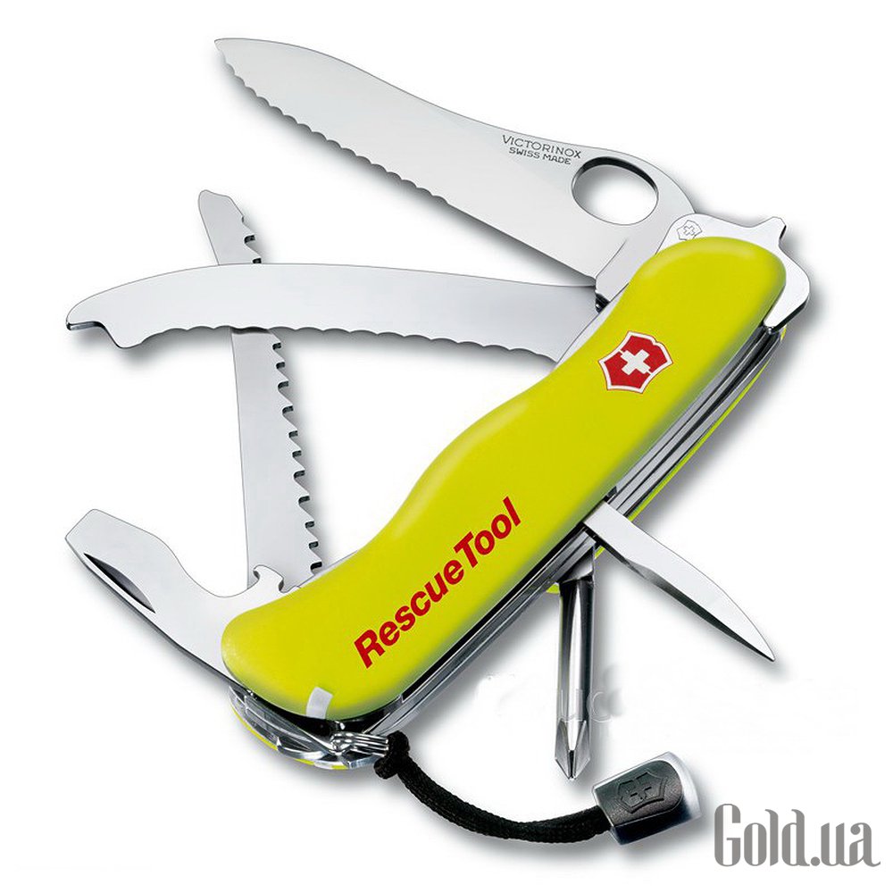 Модель RescueTool была разработана VICTORINOX совместно со службами экстренной медицинской помощи и спасения, и улучшалась в течение 5 лет. Функциональный стеклобой, надежная пила для стекла и практичное лезвие для разрезания ремня безопасности (стропорез) готовы к использованию через считанные секунды. Инструмент легко открывается даже в перчатках. В рабочем состоянии лезвие и мощная отвертка (инструмент для открывания деревянных ящиков) фиксируются замком типа «лайнер-лок». При необходимости части 3 и 12 могут быть легко замещены.