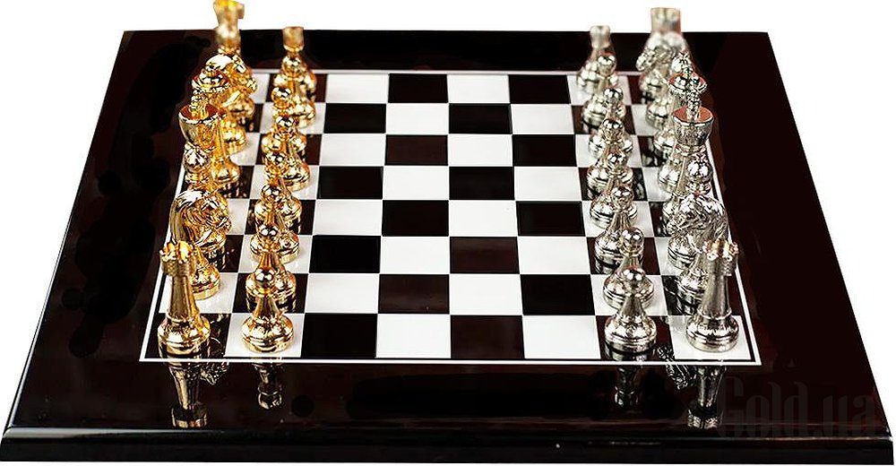 Дошка виготовлена із дерева. Розмір дошки: 40 x 40 x 2 cm, розмір квадрата: 3,5 cm. Фігурки колекції "Staunton" виготовлені з латуні + золото 24К та срібло 925 проби. Розмір короля: 7,5 cm – Ø base 2,5 cm.