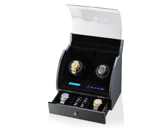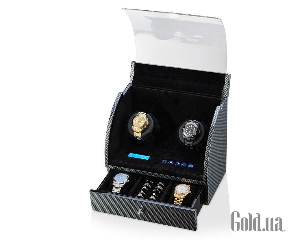 Тайммувер для 2-х годинників + висувна скринька для зберігання годинників або прикрас від відомого німецького бренду ROTHENSCHILD. Відполірований корпус із цільного дерева, покритий лаком із розписом у кілька шарів. Всередині коробки чорна шкіра. 12 комбінацій програми на вибір. Три типи підзаводу: за годинниковою, проти годинникової стрілки та обидва разом. Число обертів, що настроюється: 650,750,850,1000,1950 на добу. Сенсорне керування. Відображення поточних налаштувань на дисплеї LCD. Цей пристрій добре підходить для великих, важких годинників. Працює від мережі. Мережевий адаптер входить у комплектацію.