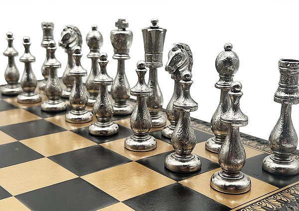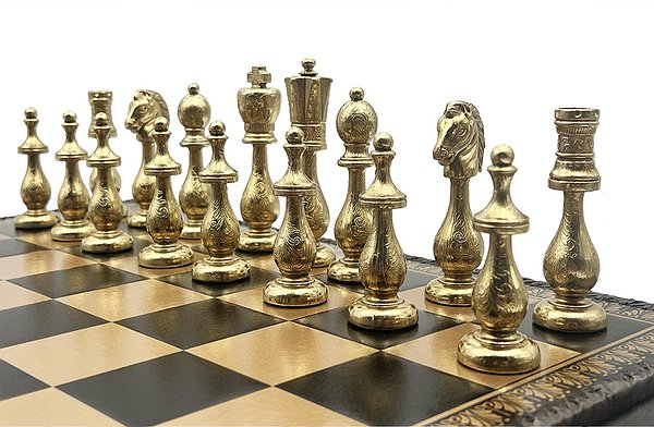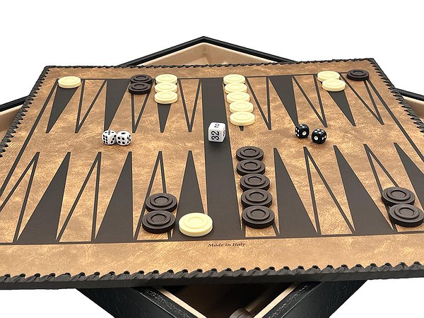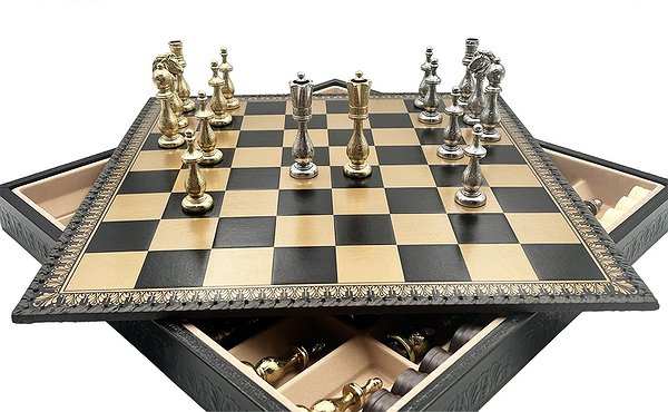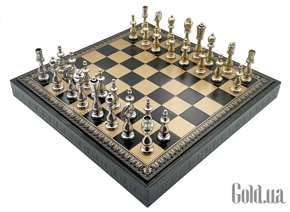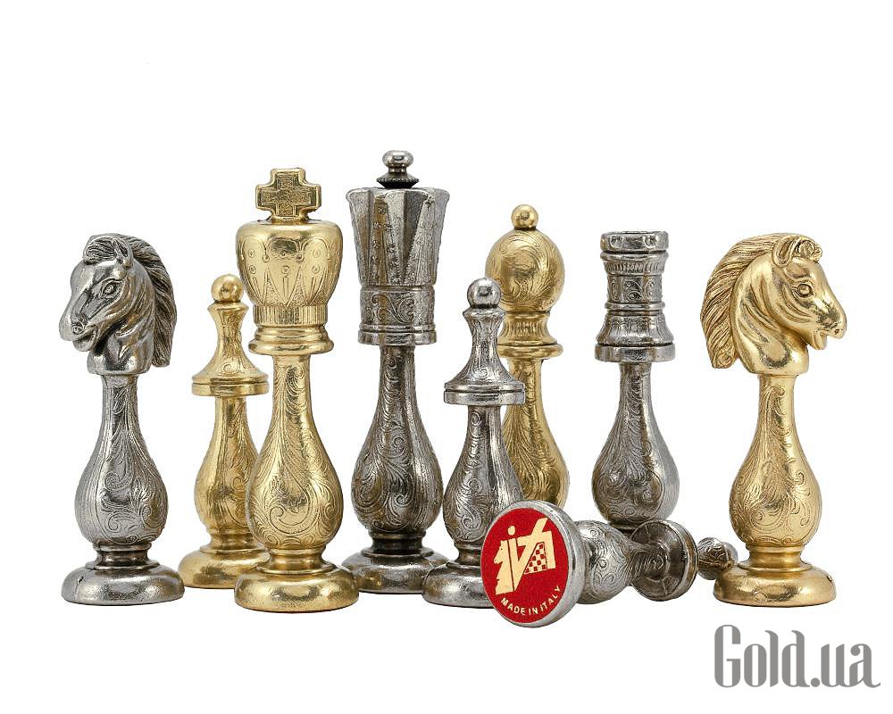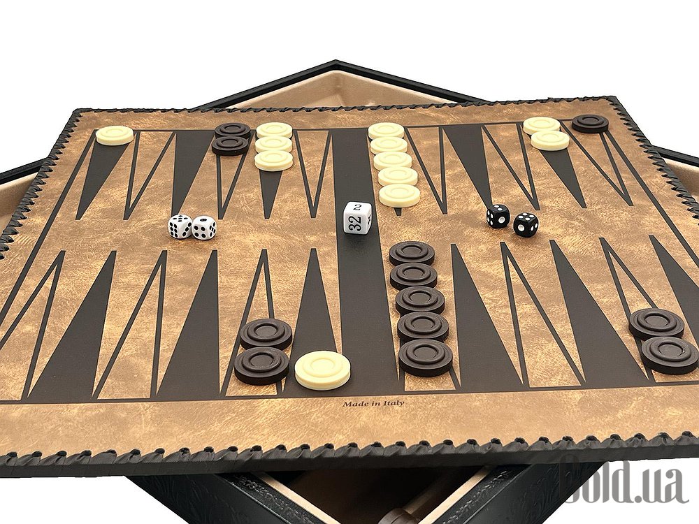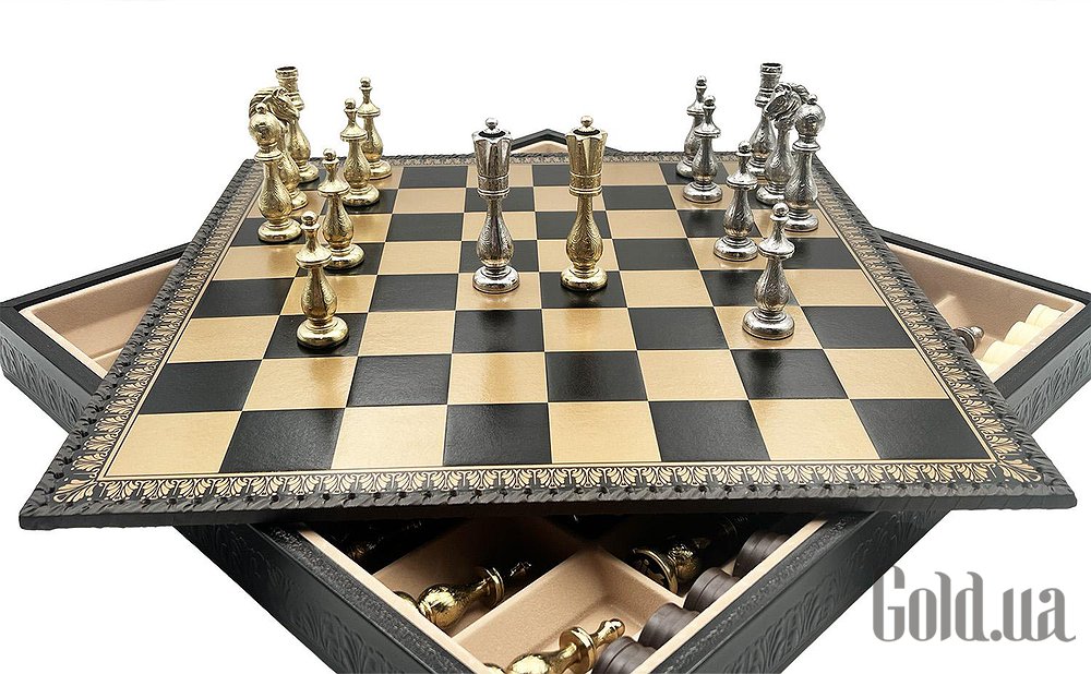 Дошка виготовлена з дерева та екошкіри. Розмір дошки: 48 x 48 x 5,5 cm, розмір квадрата: 5,2 cm. Фігурки колекції ARABESQUE виготовлені з латуні та нікелевого покриття. Розмір короля: 10,0 cm – Ø діаметр 3,0 cm. У комплекті йдуть шашки, нарди.