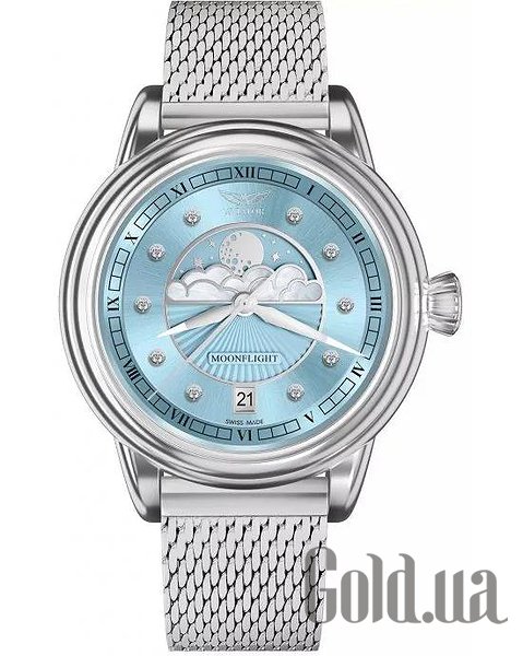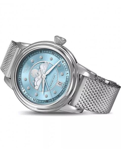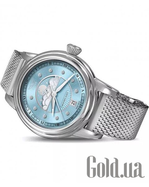 Циферблат: Небесно-блакитний з малюнком у вигляді сонячних променів, перламутровими хмарами та діамантовими мітками (10 діамантів, VS2/F, 0.058 ct), сертифікат на справжні натуральні діаманти у комплекті
