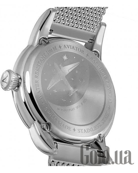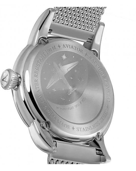 Кожна модель AVIATOR має свою історію. Погляньте на кришку корпусу годинника MoonFlight і побачите вигравіруване зображення літака Douglas DC-3 у таємничому місячному світлі. Зображення оживає завдяки застосуванню безлічі технік обробки, а саме гравірування трохи втиснуте в кришку, що надає їй додаткової витонченості. Кришка надійно закріплена на корпусі сталевими гвинтами, а значить, ви можете почати з занурення у воду, де виглядатимете не менш елегантно, адже годинник водонепроникні на глибині до 100 метрів.