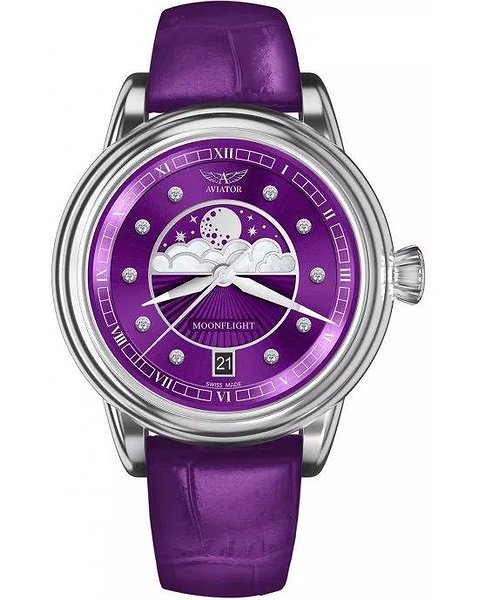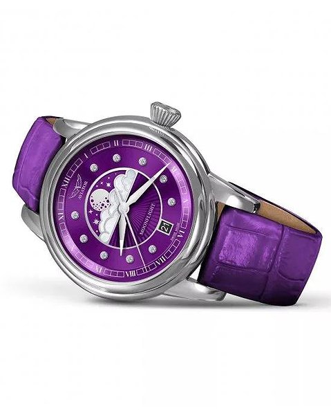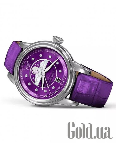 Циферблат: Фіолетовий з малюнком у вигляді сонячних променів, перламутровими хмарами та діамантовими мітками (10 діамантів, VS2/F, 0.058 ct), сертифікат на справжні натуральні діаманти в комплекті