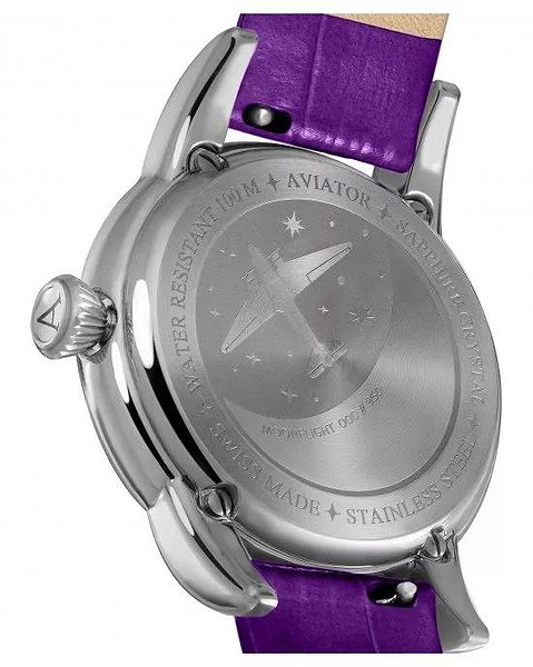 Кожна модель AVIATOR має свою історію. Погляньте на кришку корпусу годинника MoonFlight і побачите вигравіруване зображення літака Douglas DC-3 у таємничому місячному світлі. Зображення оживає завдяки застосуванню безлічі технік обробки, а саме гравірування трохи втиснуте в кришку, що надає їй додаткової витонченості. Кришка надійно закріплена на корпусі сталевими гвинтами, а значить, ви можете почати з занурення у воду, де виглядатимете не менш елегантно, адже годинник водонепроникні на глибині до 100 метрів.