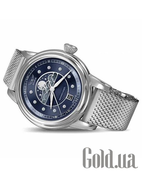 Циферблат: Синій з малюнком у вигляді сонячних променів, перламутровими хмарами та діамантовими мітками (10 діамантів, VS2/F, 0.058 ct), сертифікат на справжні натуральні діаманти в комплекті