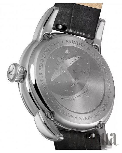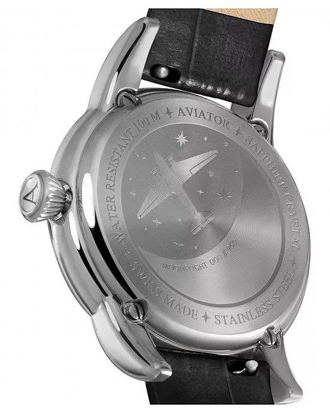 Кожна модель AVIATOR має свою історію. Погляньте на кришку корпусу годинника MoonFlight і побачите вигравіруване зображення літака Douglas DC-3 у таємничому місячному світлі. Зображення оживає завдяки застосуванню безлічі технік обробки, а саме гравірування трохи втиснуте в кришку, що надає їй додаткової витонченості. Кришка надійно закріплена на корпусі сталевими гвинтами, а значить, ви можете почати з занурення у воду, де виглядатимете не менш елегантно, адже годинник водонепроникні на глибині до 100 метрів.
