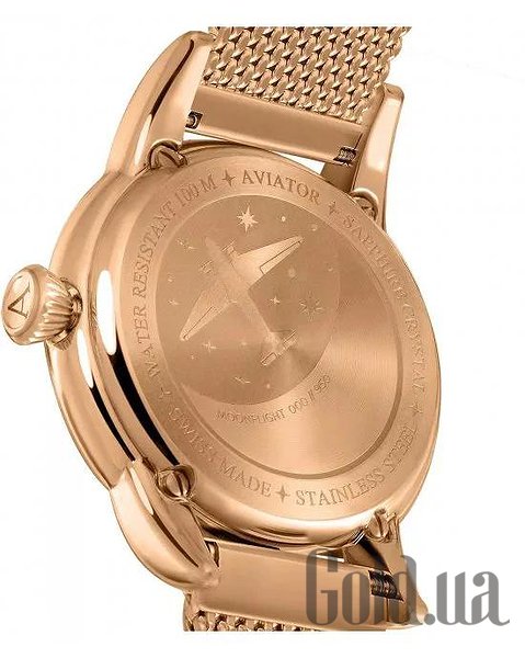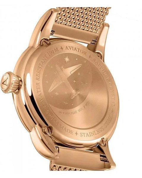 Кожна модель AVIATOR має свою історію. Погляньте на кришку корпусу годинника MoonFlight і побачите вигравіруване зображення літака Douglas DC-3 у таємничому місячному світлі. Зображення оживає завдяки застосуванню безлічі технік обробки, а саме гравірування трохи втиснуте в кришку, що надає їй додаткової витонченості. Кришка надійно закріплена на корпусі сталевими гвинтами, а значить, ви можете почати з занурення у воду, де виглядатимете не менш елегантно, адже годинник водонепроникні на глибині до 100 метрів.