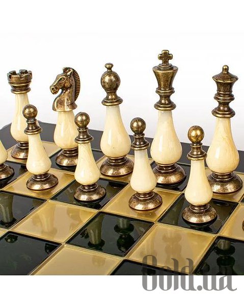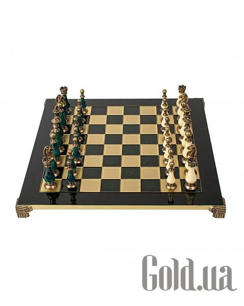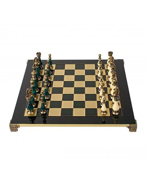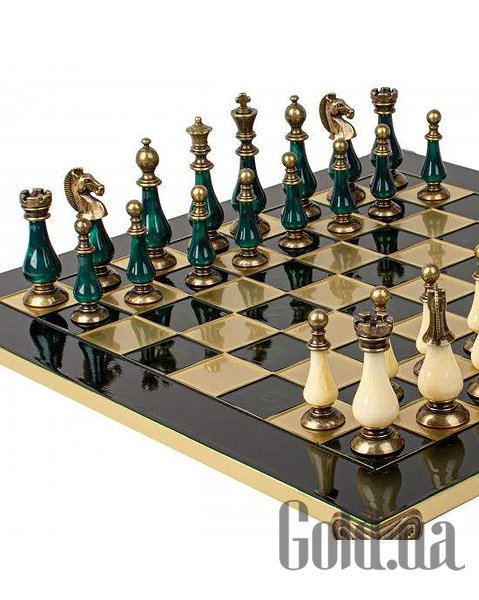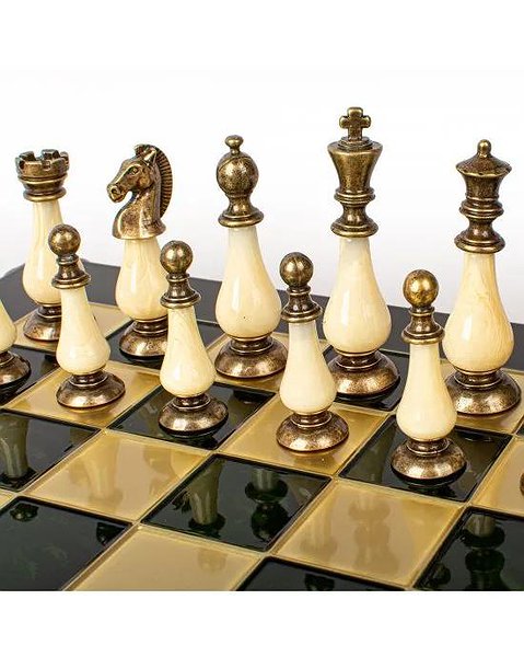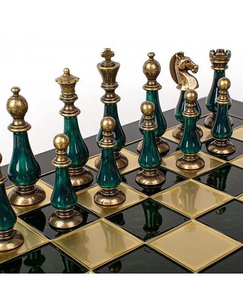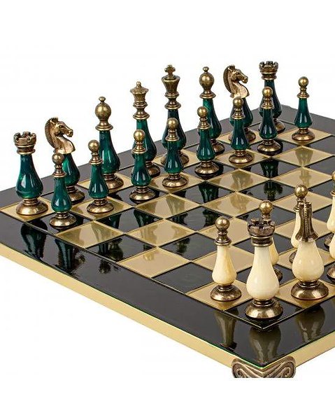 Цей великий набір включає латунну шахівницю розміром 44x44 см, що пропонує вишукану ігрову поверхню, яка чудово поєднується із зеленими та кольорами слонової кістки металевими шаховими фігурами.