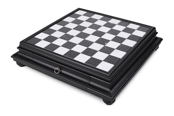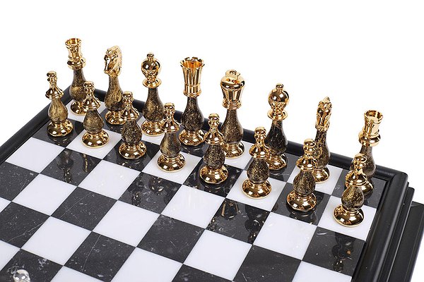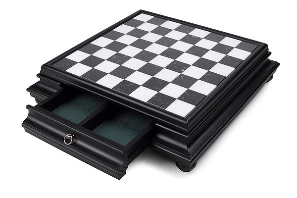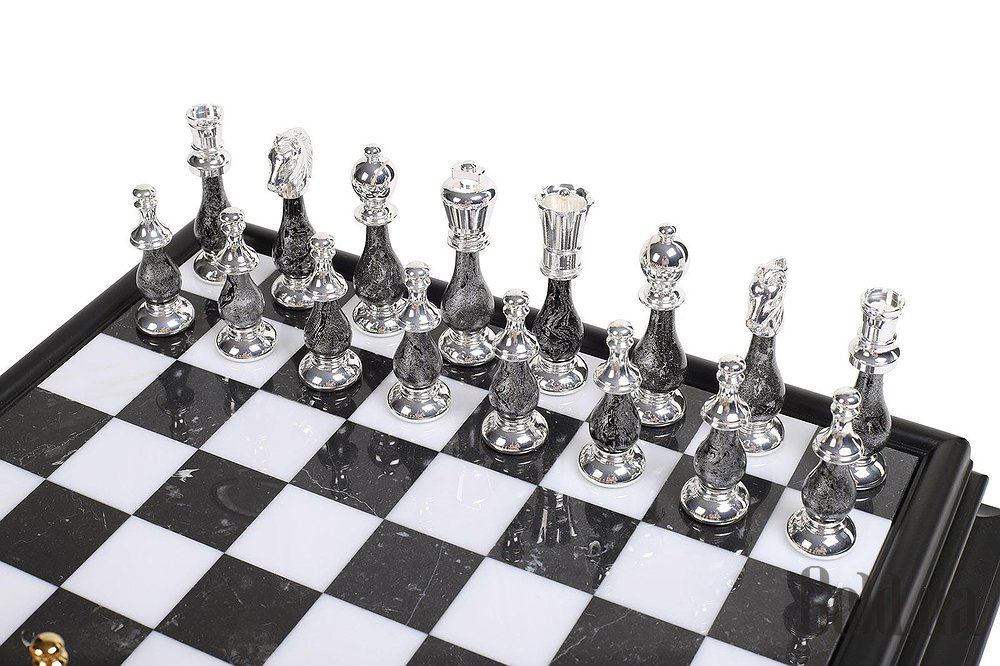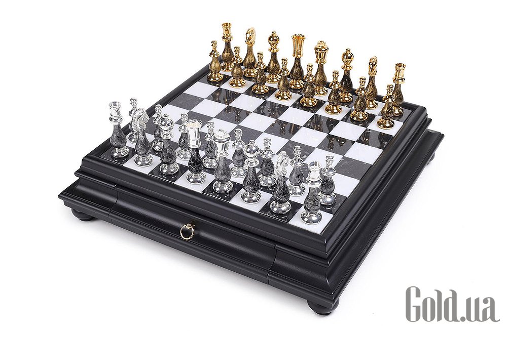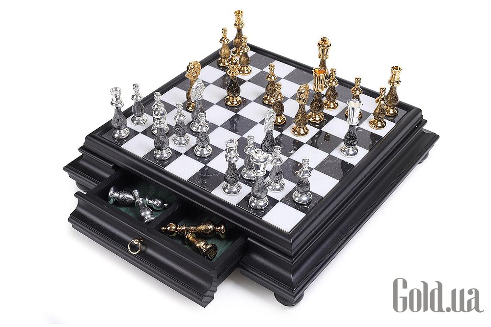 Дошка виготовлена з дерева та мармуру з висувним шухлядком для зберігання фігурок. Розмір дошки: 47 x 47 x 12 cm, розмір квадрата: 4,5 cm. Фігурки виготовлені з латуні та дерева + золото 24 карати та срібло 925 проби. Розмір короля: 10 cm – Ø діаметр 2,9 cm.