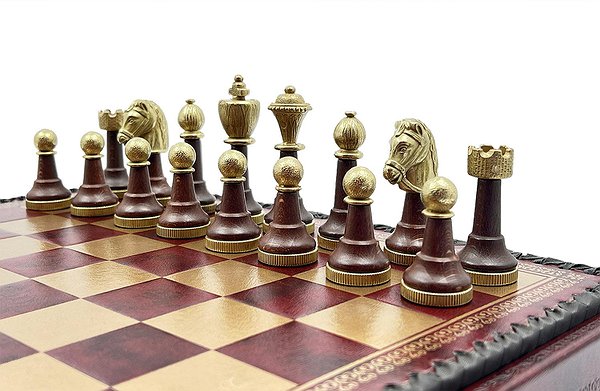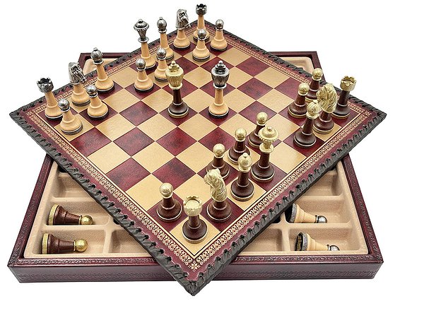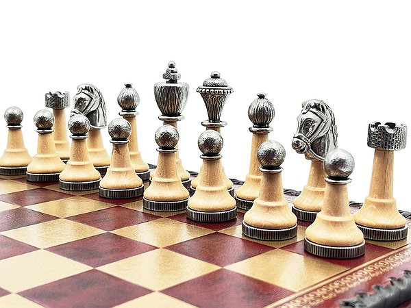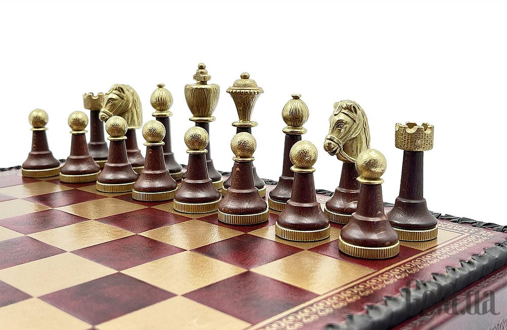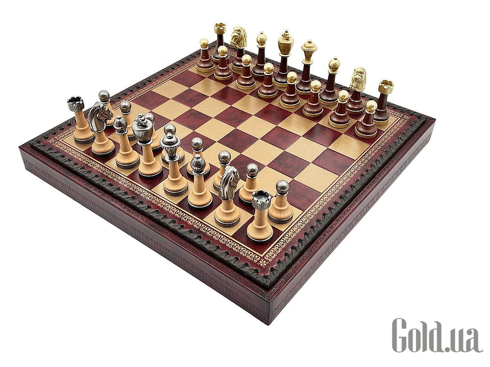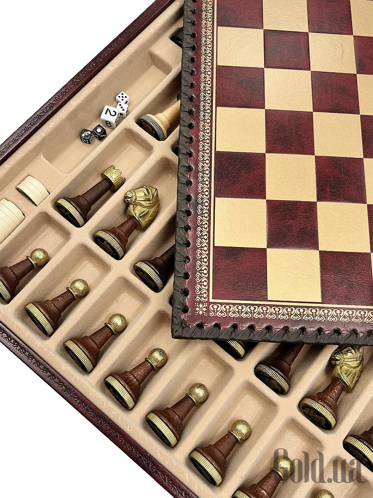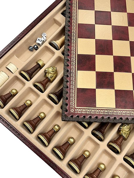 Дошка виготовлена з екошкіри. Розмір дошки: 35 x 35 x 4 cm, розмір квадрата: 3,5 cm. Фігурки колекції Staunton виготовлені з дерева, цинку, латуні, нікелю. Розмір короля: 7,5 cm – Ø base 2,5 cm. У комплекті йдуть шашки, нарди.