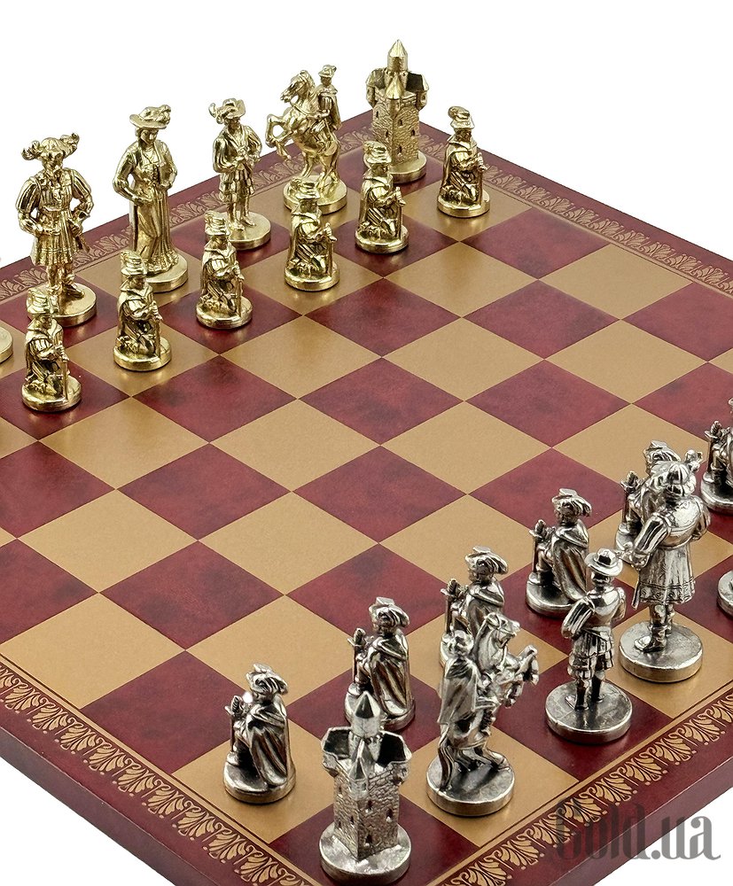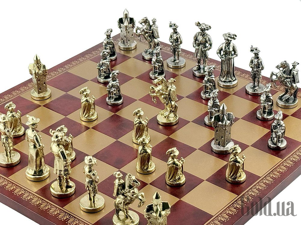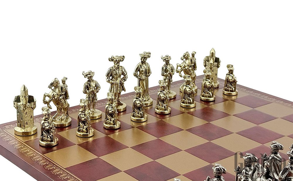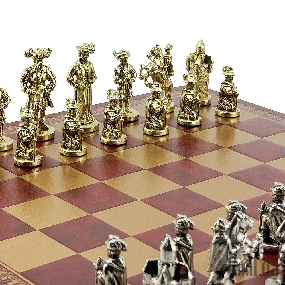 Колекційний шаховий набір Italfama – фігури LENDSKNECHT (метал) + дошка з екошкіри Gold/Burgundy 45×45 см.