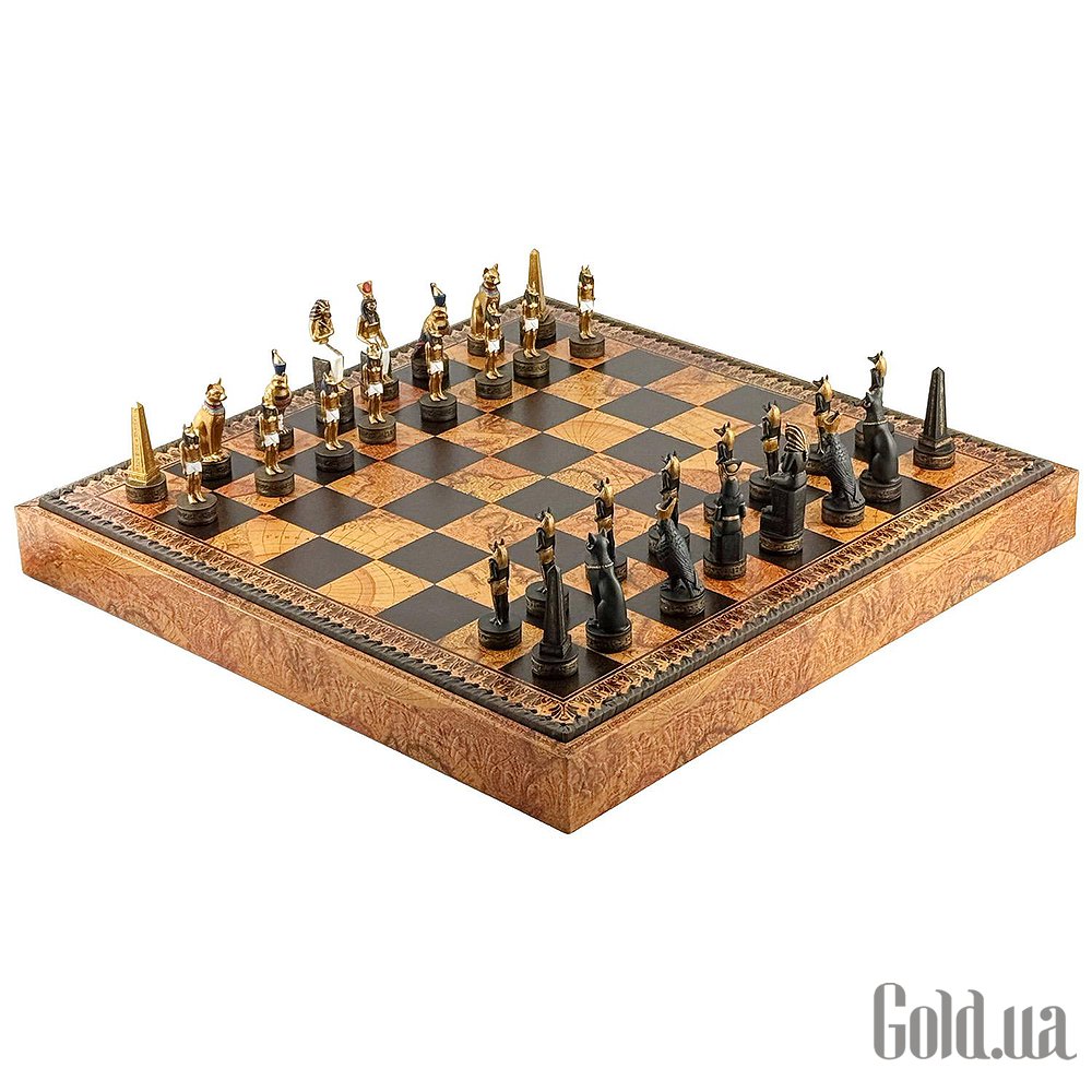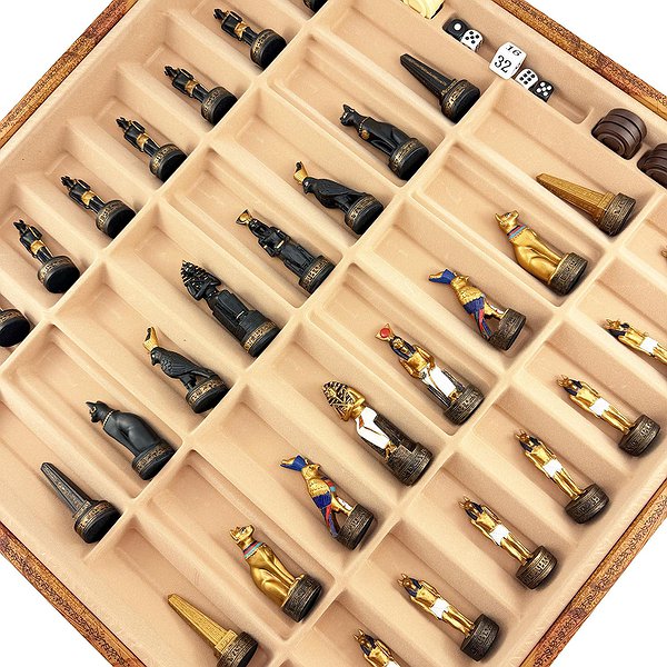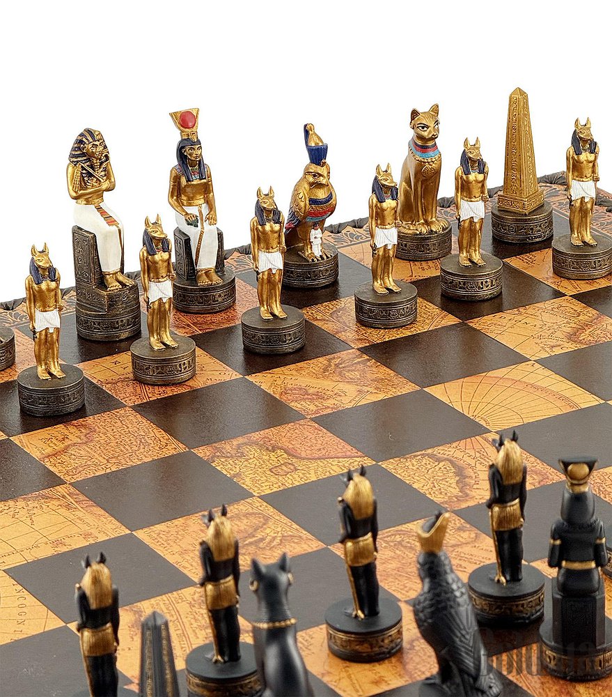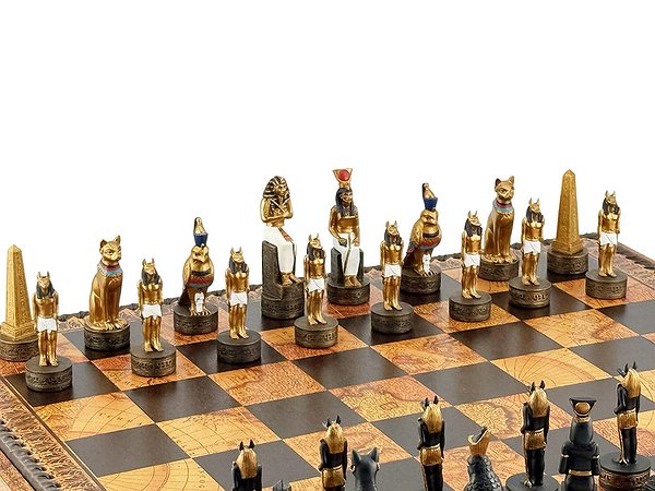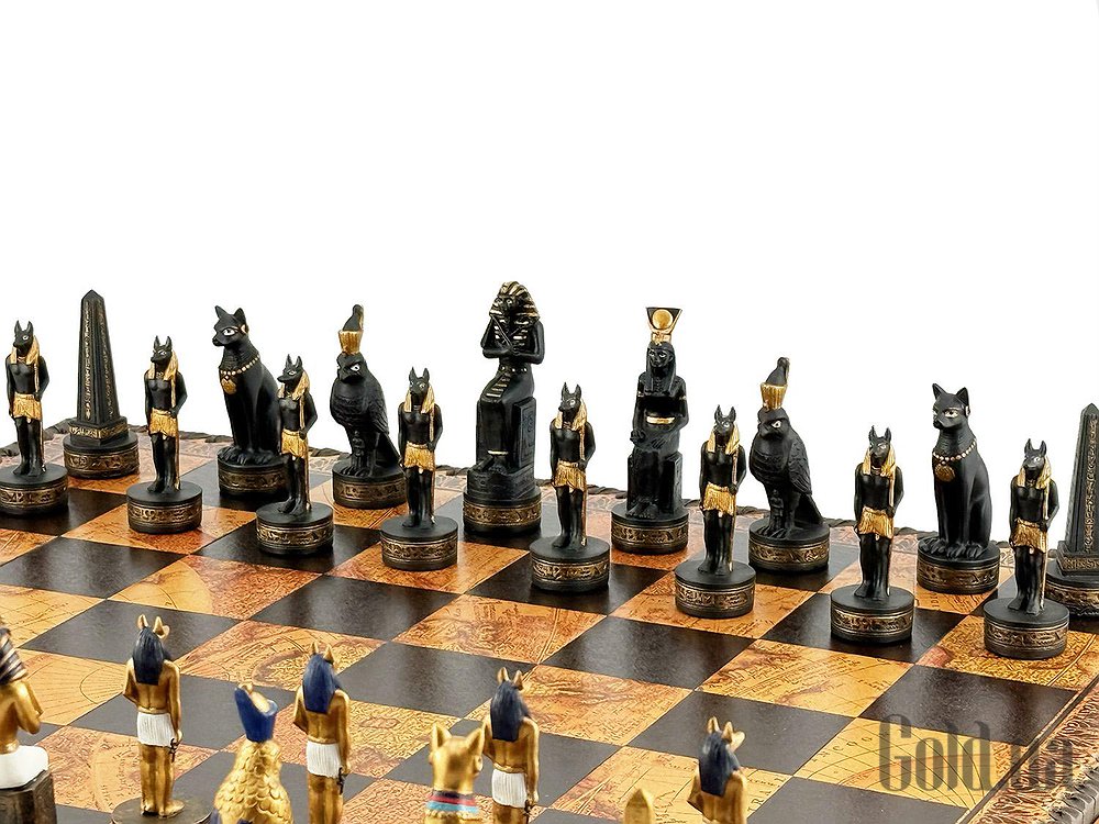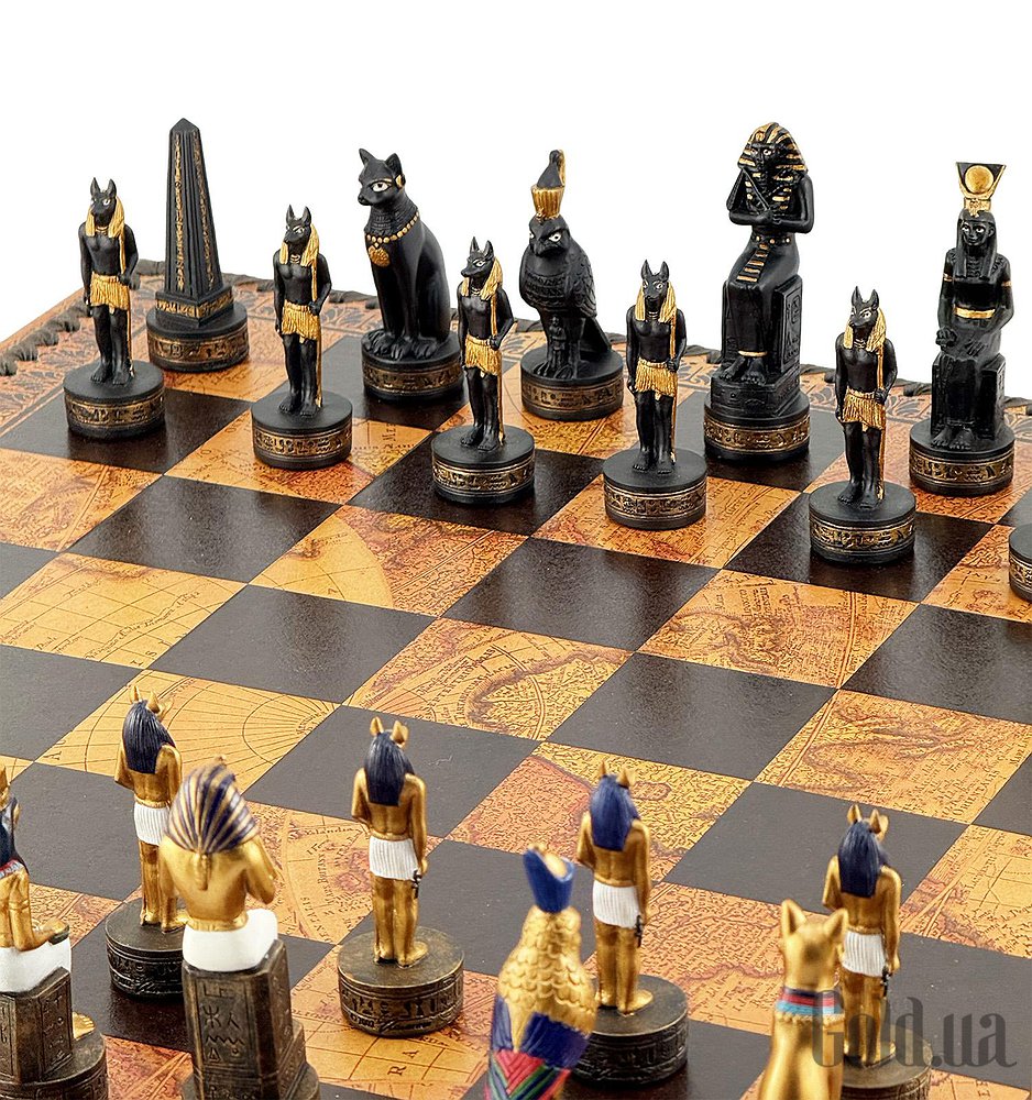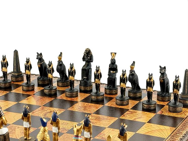Цей яскравий шаховий набір натхненний культурою Стародавнього Єгипту. Фігури зображують Фараона, Царицю, Обеліск та єгипетських богів Хора та Мафдет. Кожна фігура відрізняється високою деталізацією та розписана вручну.