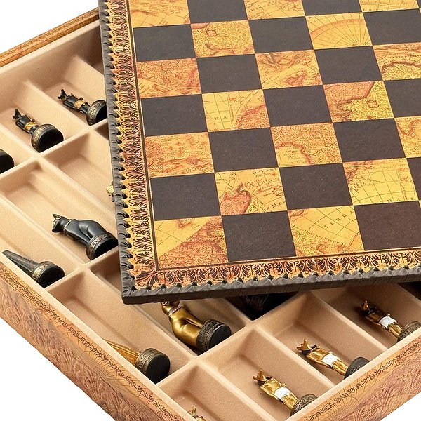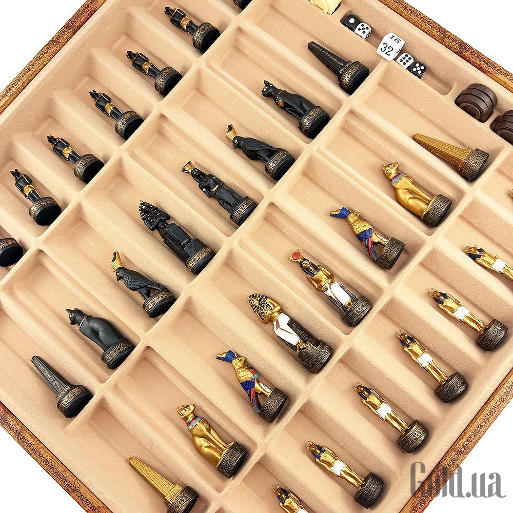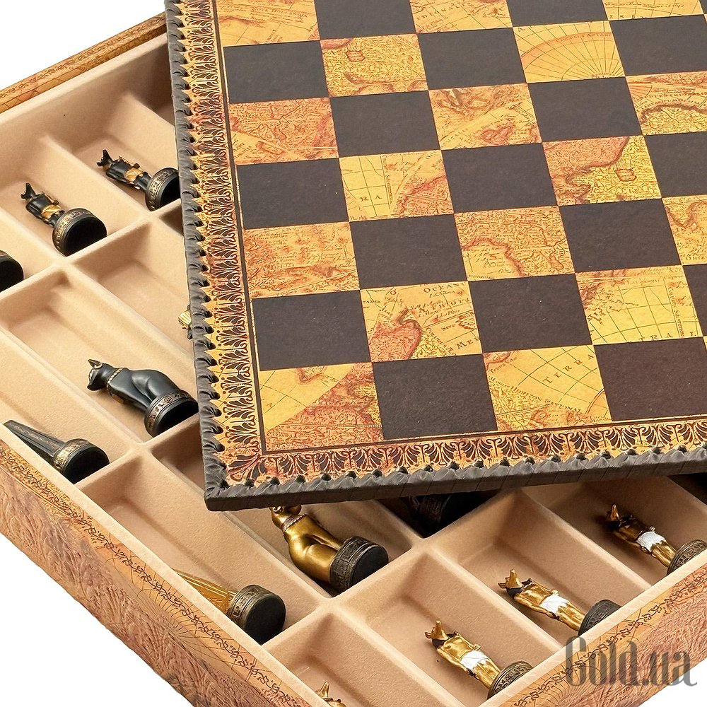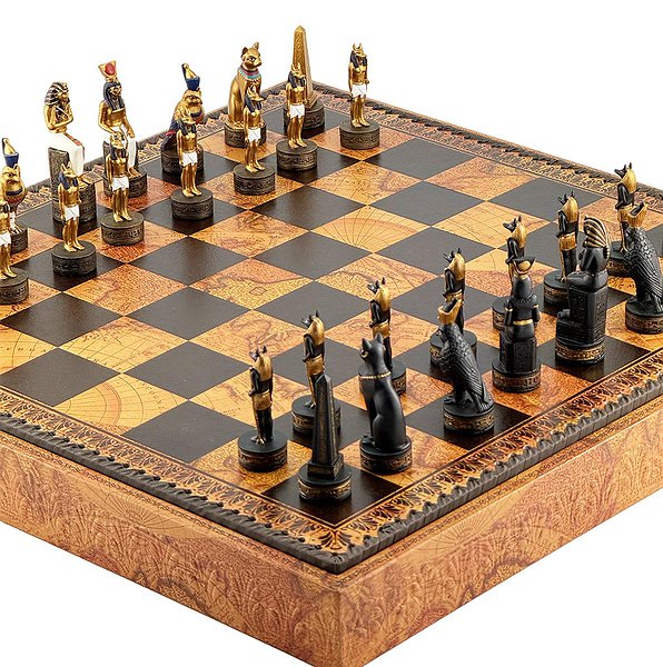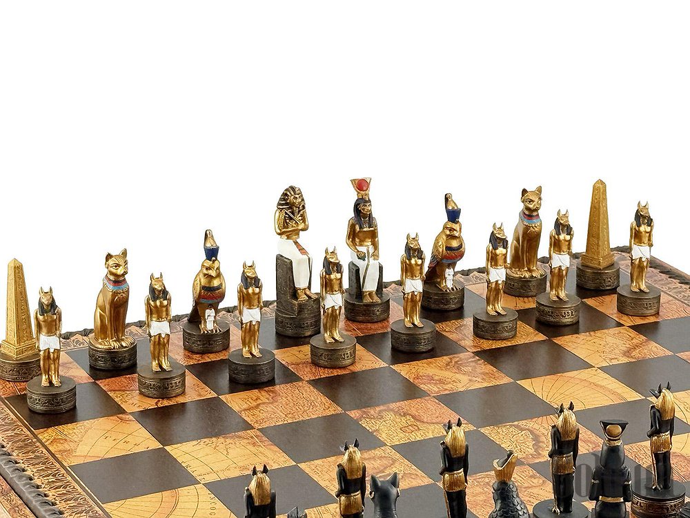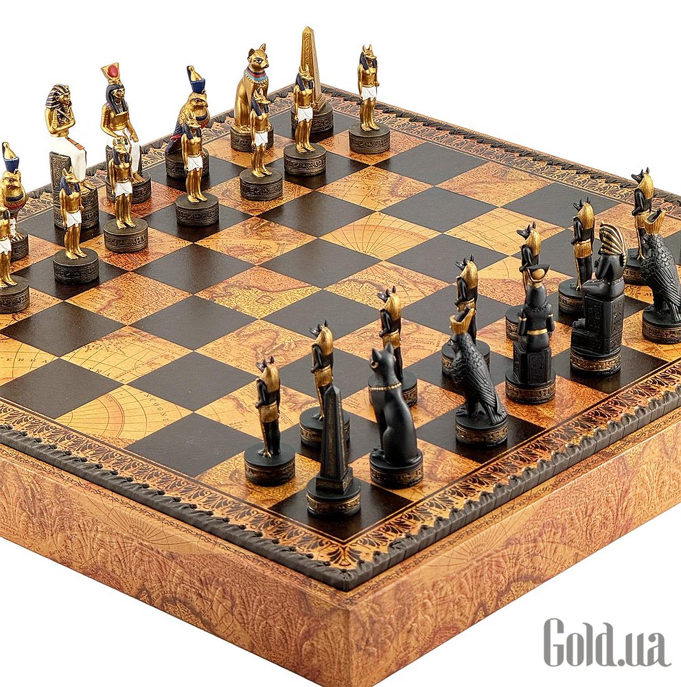Цей яскравий шаховий набір натхненний культурою Стародавнього Єгипту. Фігури зображують Фараона, Царицю, Обеліск та єгипетських богів Хора та Мафдет. Кожна фігура відрізняється високою деталізацією та розписана вручну.