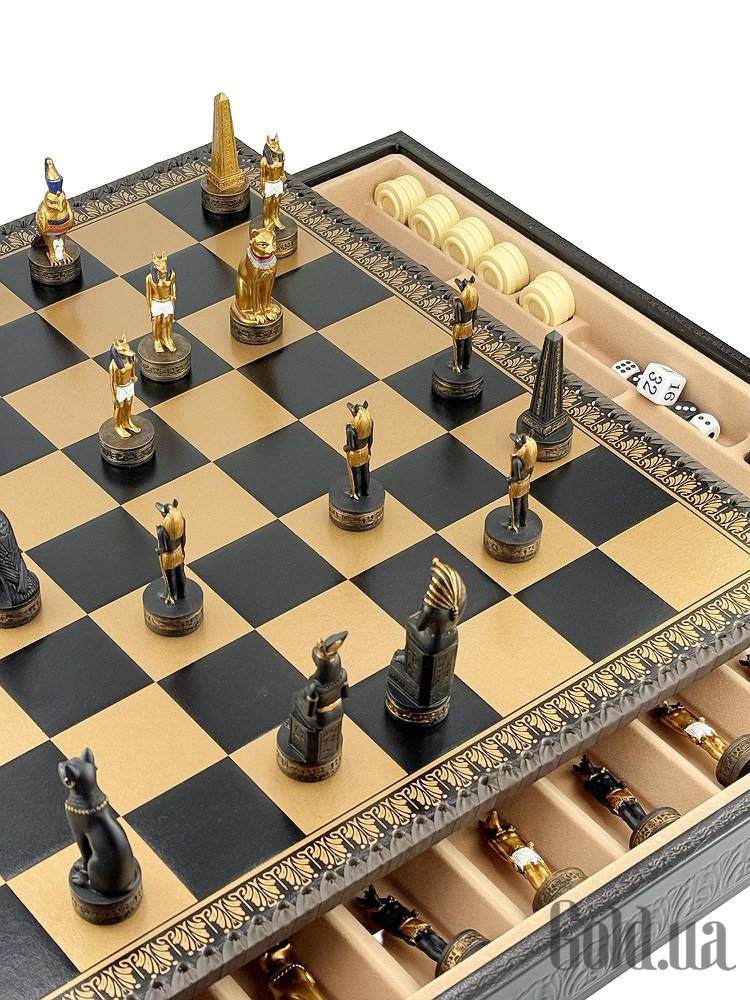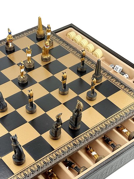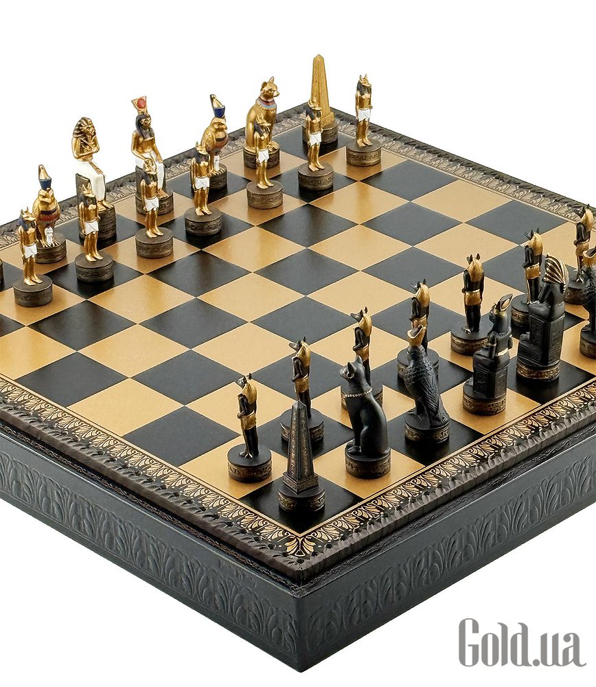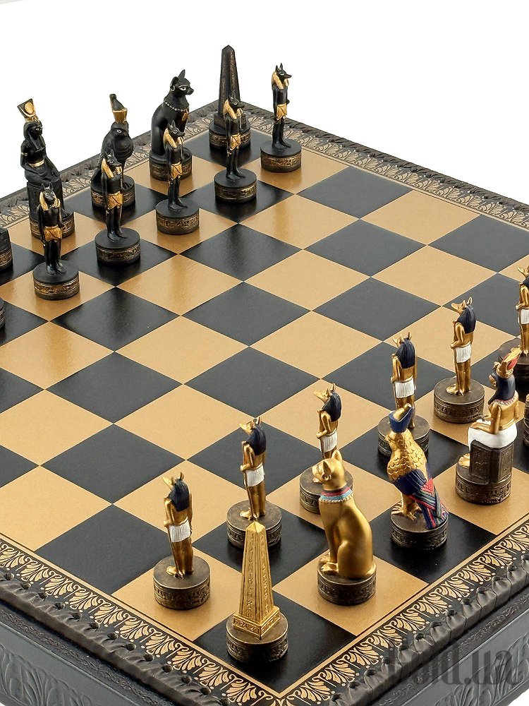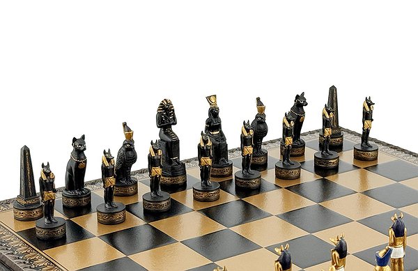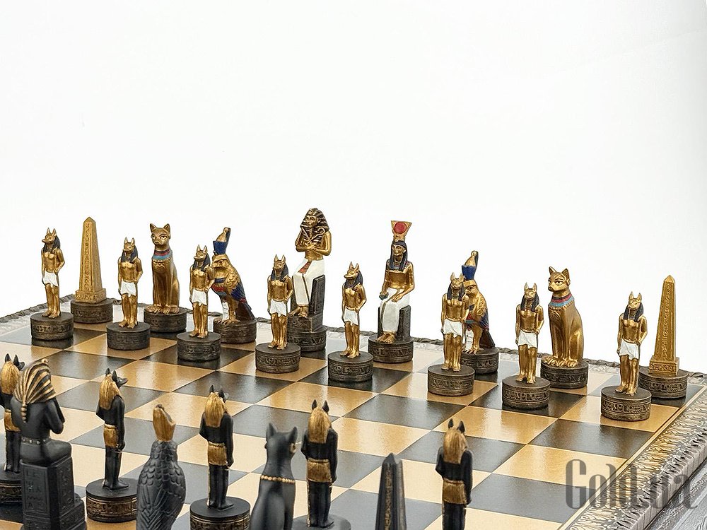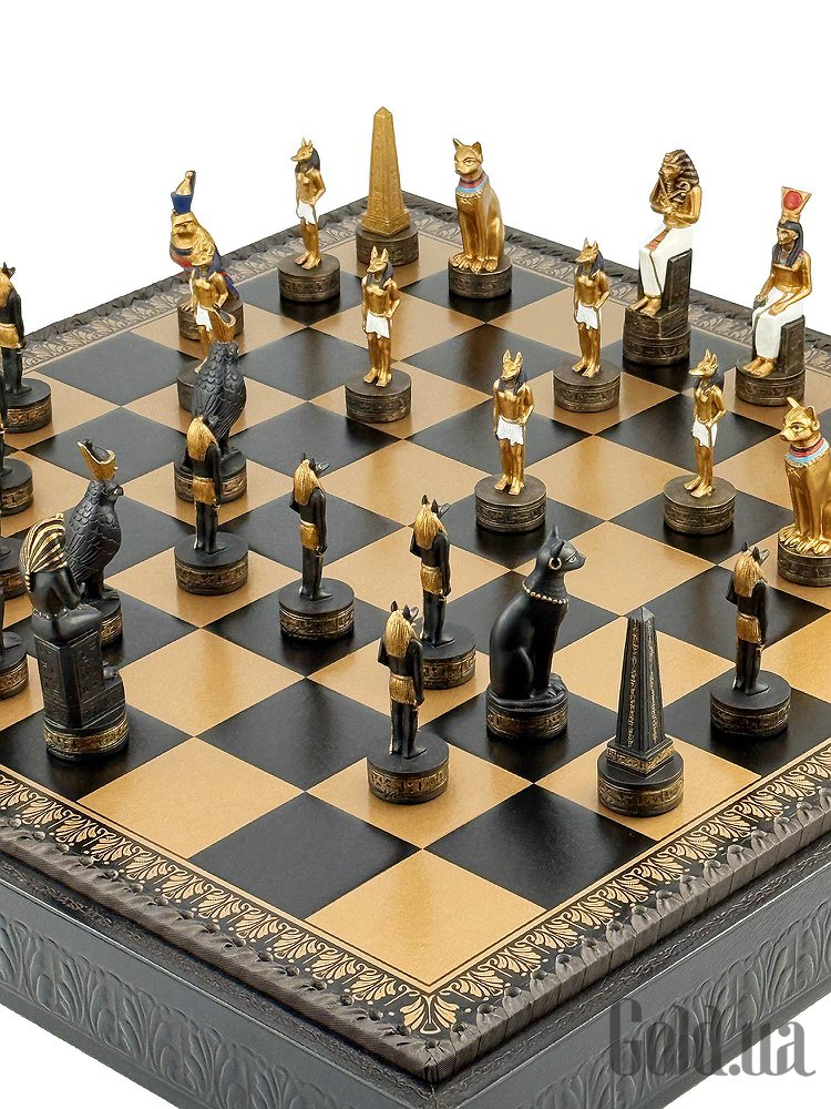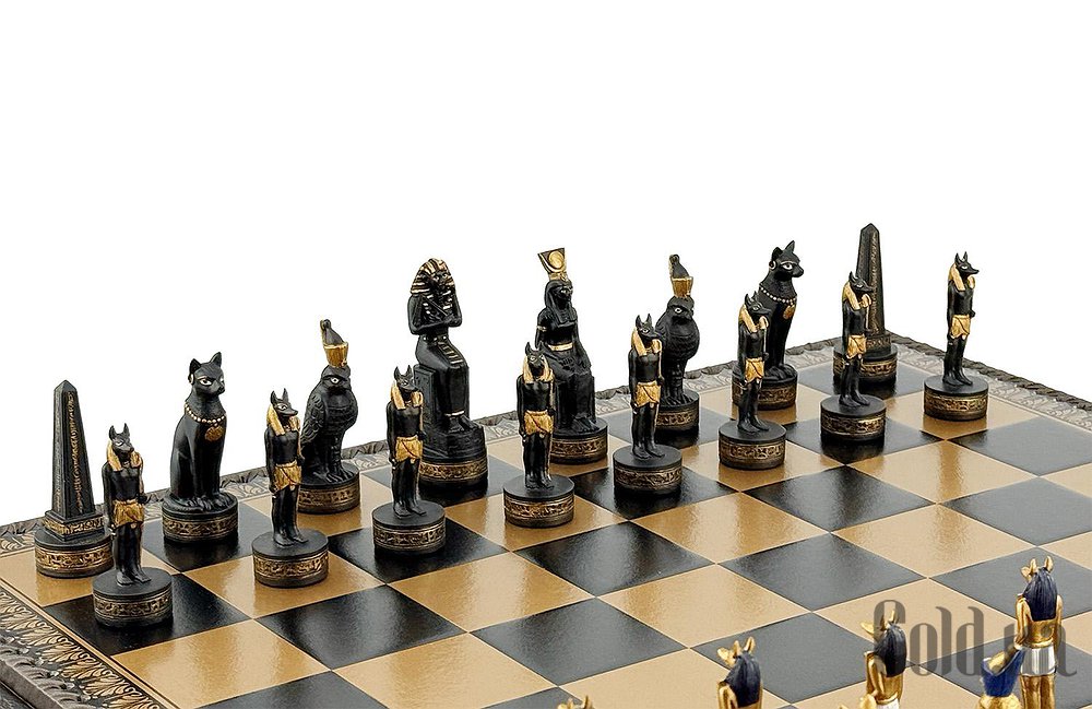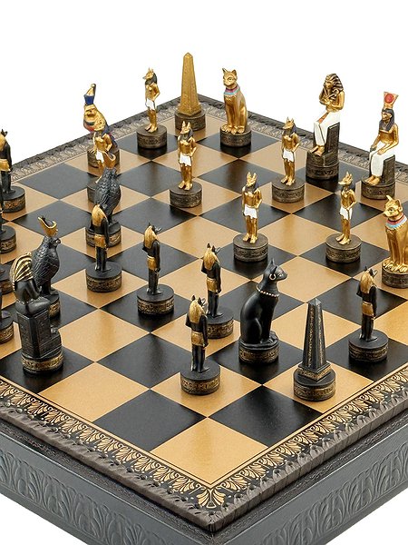 Цей яскравий шаховий набір натхненний культурою Стародавнього Єгипту. Фігури зображують Фараона, Царицю, Обеліск, а також єгипетських богів Хора та Мафдет. Кожна фігура відрізняється високою деталізацією та розписана вручну.