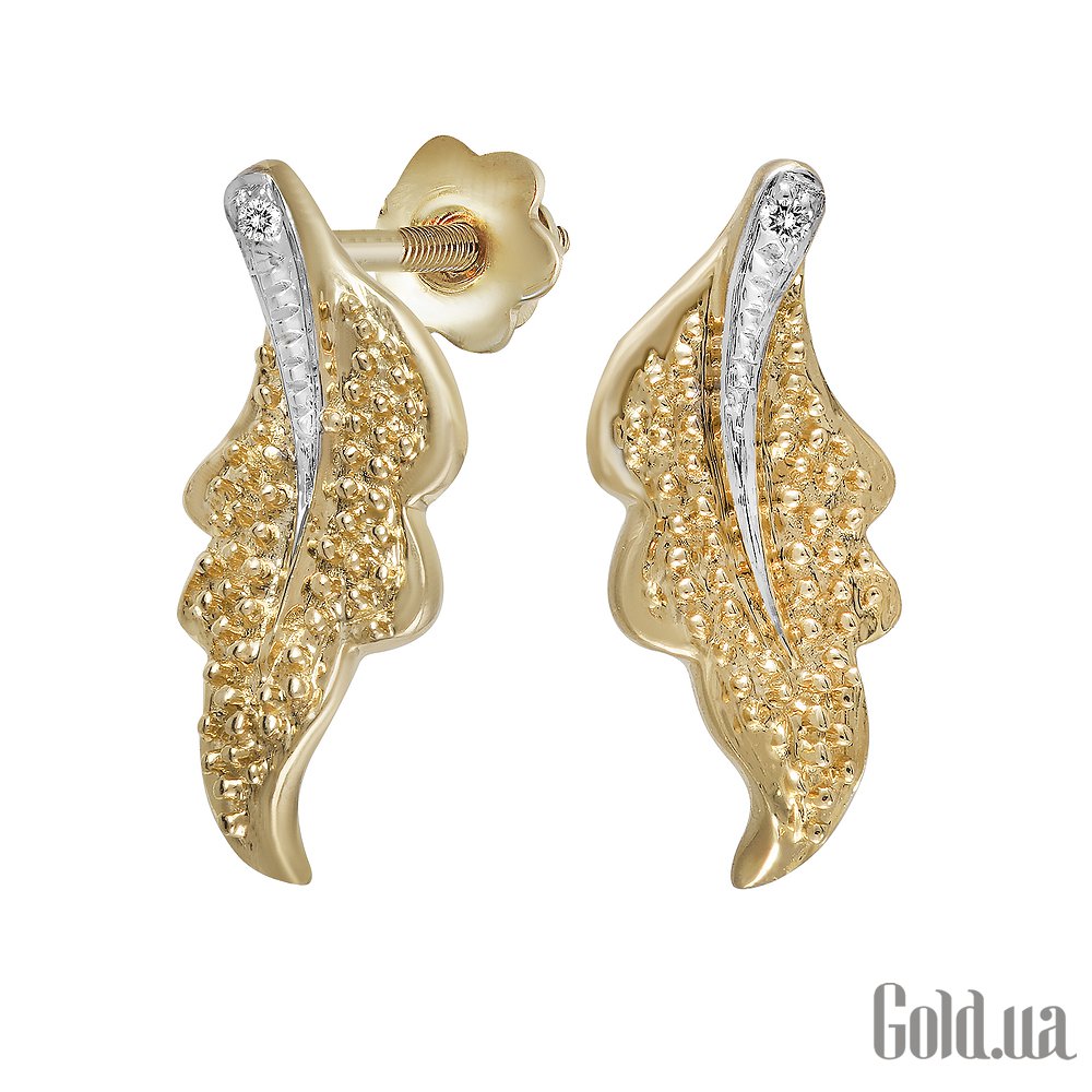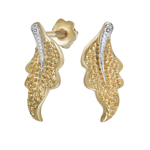 Природний стиль золотих сережок виділяється оригінальністю оздоблення, стриманістю форми і приголомшливою елегантністю. Подовжена форма листочків, які стали інтригою прикраси, і жовті фарби золотистого металу створюють класичний вигляд прикраси, захоплюючи грацією і жіночністю. Зерниста структура тіла листа, тонка насічка гребенів, що утворюють сріблясто-білі прожилки, - все дивує винахідливістю і художнім смаком дизайнера. У вершині виблискує іскристий діамант, як заключний акорд.
